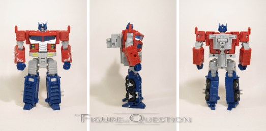 In terms of alt modes, Optimus follows the trend set by Ultra Magnus, with three distinct ones. The first is the core bot mode, and this is the one where the Magnus re-use becomes the most evident, as they’re virtually the same. The only sculptural (but not functional) difference is the tooling on the front of his torso, as well as a swapped out front to is pelvis piece. Neither are overly different; the pelvis in particular is easily missed, but the new torso is slightly more pointed and, following the trend of the outer armor, more streamlined when compared to Magnus. It’s a subtle change, but one that really sells the differences between the characters. A less subtle change is the color scheme, which swaps out the monochromatic look of Magnus for something more in line with Optimus’ usual primary colors. This, coupled with the change in sculpt, makes the figure undeniably Optimus Prime, rather than Prime-inspired like it was before.