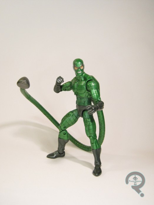 going through the very expensive process of segmenting the whole tail, there’s not much they could do. I just find the bendable nature to be tricky to work with, as it’s not quite as mobile as I might like. I suppose it’s an improvement to the static arms like we got with Doc Ock. Scorpion’s color work is pretty decent, but it does have one issue that a lot of fans aren’t liking. They’ve gone with the first appearance look for the mask, meaning the bottom of his face is painted green, rather than giving him the cowl-like appearance he would end up sporting later. While I don’t mind it so much myself, I do feel like an extra head, even just the same head with the second color-styling, would have been the best option. As it stands, Scorpion has no actual accessories of his own, though he does get the right leg of Molten Man.