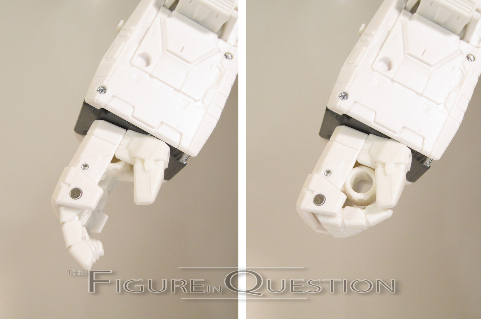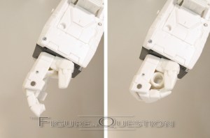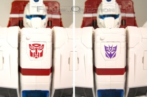 Thanks to this, when his hands are open, the port is gone, but when they’re closed, he can properly hold his accessories. It’s a great feature, and I hope they get more use out of it. Speaking of the hands, they’re also the source of my only real issue with the figure, namely how his hands connect to the forearms. To facilitate transformation, they fold out, and they have a tendency to pop out when trying to pull of routine posing with the hands, which can be slightly annoying. Jetfire has another sort of new feature has to do with his insignia. Though an Autobot by all official counts, Jetfire’s backstory frequently paints him as a reformed or at