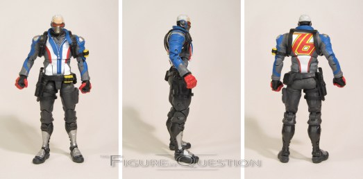 Soldier: 76!  He’s a patriotic super-soldier from the past.  Now there’s a concept I can grasp!  Unlike Ana, Soldier: 76 is based on his main game appearance.  As the most played character in the game (according to the wiki, anyway), I guess it makes sense to go with the basic look?  It helps that it’s honestly his best look, I suppose.  The figure stands 6 1/4 inches tall and he has 32 points of articulation.  Solder: 76’s sculpt is a much better balance of the various elements than Ana’s.  His articulation is far better worked into the sculpt, and far less restricted.  It’s implemented in a very similar fashion to the Lightning Collection figures, which I certainly don’t have a problem with.  Also, most of the costume is sculpted right on the core figure, with the add-ons only being for his shoulder straps and belt.  In Ana’s defense, Soldier: 76 does get something of a leg up here, with his design just generally being far more fit for translation to a figure.  Whatever the case, the sculpt is a faithful recreation of his in-game model; so faithful, in fact, that it leads to my only real complaint about the sculpt.  Soldier: 76’s game model has a holstered sidearm, which is never taken out.  This figure has that same element, and it’s ever so slightly frustrating that it’s not actually a proper gun.  Soldier: 76’s paint work is generally pretty decent, but I did notice a fair bit more slop on this guy than I’ve seen on most Hasbro figures as of late.  There’s also some noticeable spots on the “76” on the back of his jacket.  It’s nothing figure-breaking, but Hasbro has certainly done better.  76 is packed with two sets of hands (gripping and fists), his rifle, and a missile effect piece.