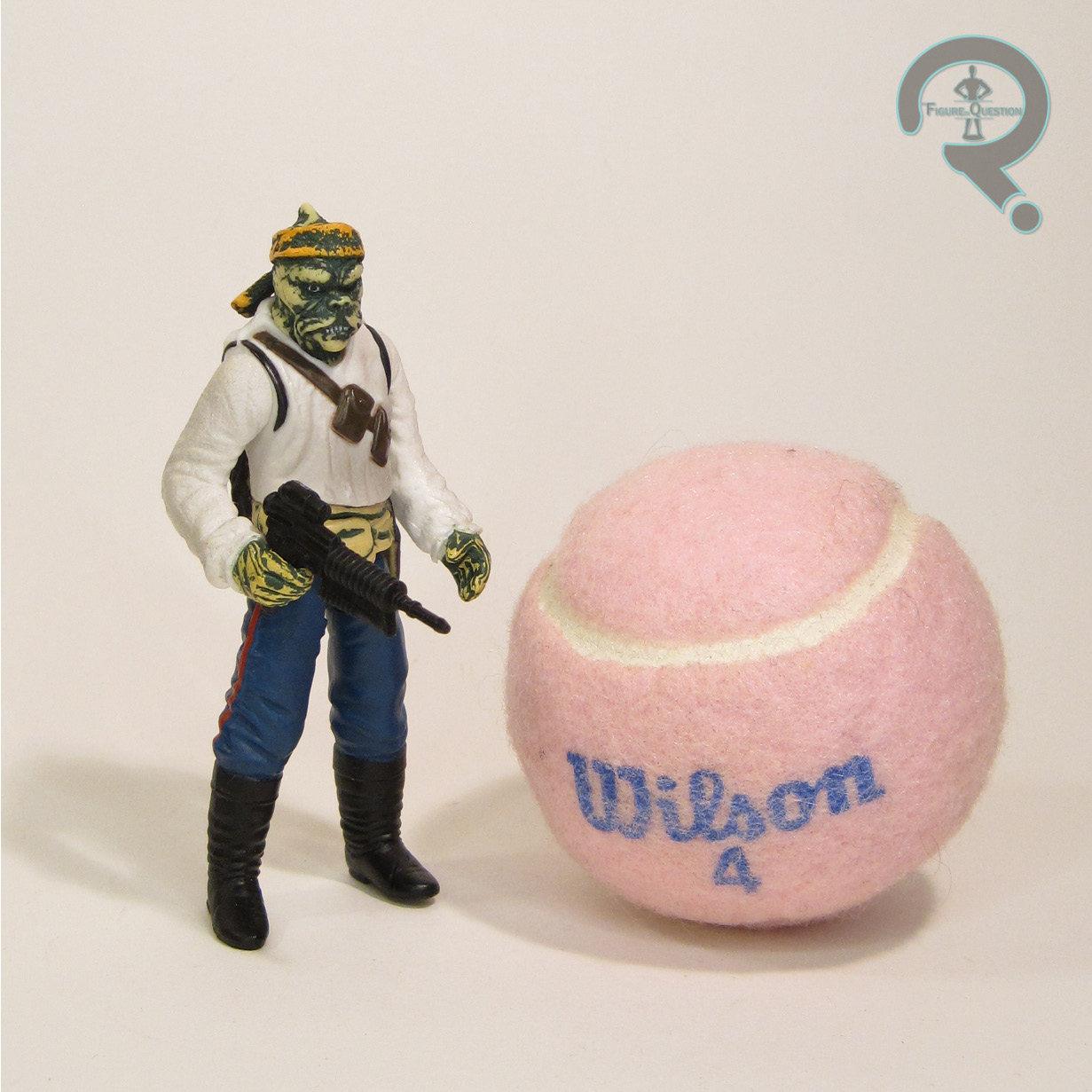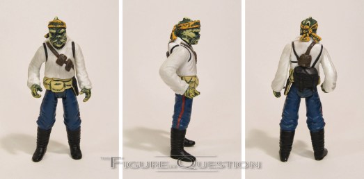 This is Nikto…wait, no, it’s actually not! Despite what the box may claim, the character’s actual name is Vizam, and he’s a member of the Kajain’sa’Nikto, a separate race of Nikto from Klaatu up above. Additionally, Vizam isn’t even present on the skiff in the movie; he’s part of Jabba’s sail barge crew (he’s seen manning one of the blaster cannons). But, there was no sail barge set, so here he is. Of the three sculpts in this set, Nikto/Vizam is actually my personal favorite. The posing on him is well executed, and I particularly appreciate how he’s sculpted to properly hold his weapon. I also dig all the work on the various layers of his outfit; it gives this figure a little more depth than his pack-mates. His paint work is again pretty decent. They were definitely starting to try out accenting here, which works well for this particular set of characters. Nikto/Vizam is packed with another pike, but this one is actually unique from the one given to Klaatu.