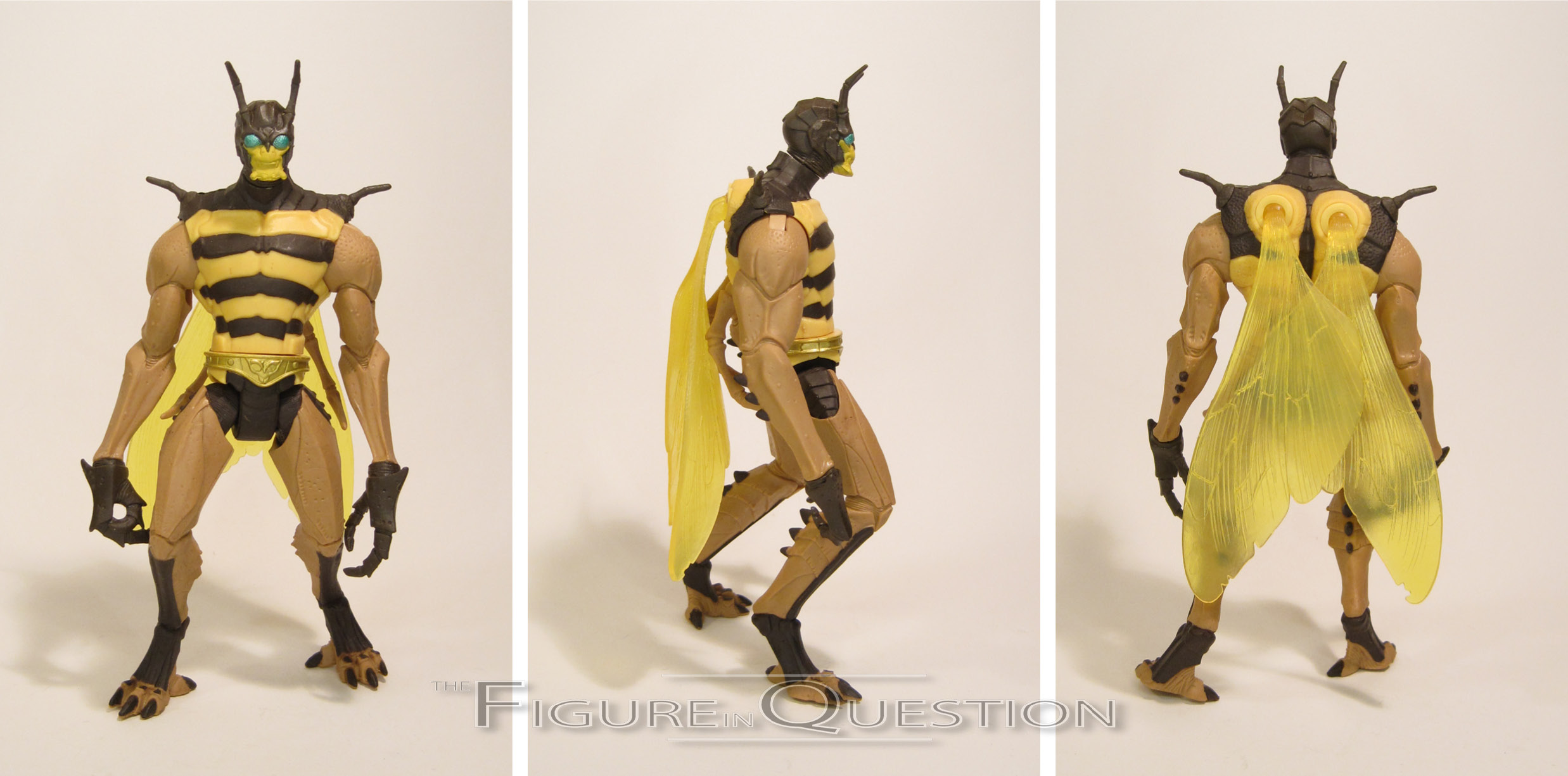 Buzz-Off was added to the re-launched Masters of the Universe toyline in 2003, as part of the fifth assortment of heroic warriors in the line, alongside three He-Man variants, Ram-Man, Man-E-Faces, and Roboto. The figure is roughly 6 1/2 inches tall and he has 17 points of articulation, thanks to the inclusion of ball-joints on the wings and little arms on his back. That makes him one of this line’s most articulated figures. The vintage Buzz-Off figure was designed to share parts with the villainous Whiplash. I know, when I think of bees and reptiles, I see the similarities too. For the 2002 relaunch, both characters got starkly divergent treatments, which was probably for the best on both counts. While swollen and muscle bound was the only way to go for the vintage line, Buzz-Off’s recreation was now svelte and angular, easily one of the most slimmed down designs of this whole iteration of the brand. It’s a quite unique look, and much like Roboto from the same assortment, it takes a much goofier design and makes it a little bit more palatable in the context of the wider story and the type of character than Buzz-Off is supposed to be. When it came time to adapt the character to the new cartoon, Buzz-Off received a noticeably drab color scheme, drastically different from his old look. For the figure proper, he more meets in the middle. The basics of the old design are definitely still there, but he looks less like “wrestler in a bee” costume this time around. Buzz-Off was packed with an axe (with launching, because that’s how axes work) and a pair of goggles for protecting his eyes while flying, I guess.
