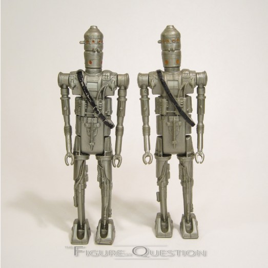 IG-88 was released in the first assortment of Kenner’s The Empire Strikes Back line, debuting alongside the movie in 1980.  There were two notable variations of IG-88, most easily identified by the finish of the plastic.  Early IGs were a more metallic silver, while later in the run he was shifted over to a duller grey.  The one up top is the silver, but there’s a comparison shot of the two at the end of the review. No matter the variation you have, the figure stands about 4 inches tall (he was a tall boy) and he has 5 points of articulation.  The two versions of the figure actually had slightly different molds, although they were more or less the same sculpt, just with some minor manufacturing tweaks.  The initial sculpt is actually really strong, quite possibly the best sculpt to come out of the vintage line.  While he fits right in with the rest of the figures stylistically, he’s incredibly sharply detailed, and sports pretty much all of the elements he should for a proper screen accurate IG.  The sculpt was so good, that Kenner actually ended up re-using it with just one tweak when it came time for the PotF IG-88, but that’s a discussion for a later review.  For the later run IGs, the sculpt is slightly downgraded.  It’s still one of the best of the vintage line, mind you, and all of the important elements remain, but some of the smaller details are lost and the overall crispness of the sculpt is also gone.  There’s also one piece completely mission on the right leg, and protrusions from the head are generally cut shorter.  If you don’t compare the two, you wouldn’t really know what you were missing.  For the paint work, IG-88 was kind of light, with molded plastic making up most of it.  The bandolier is painted black on both figures, and the lights on the head are red on the silver figure and orange on the grey.  The application on the silver is a little more precise, lending to more of that sharpness like we saw with the sculpt.  Both versions of IG-88 were packed with two blaster rifles, one short, one long, molded in a dark blue, which is probably the thing that most gives away this figure as vintage.