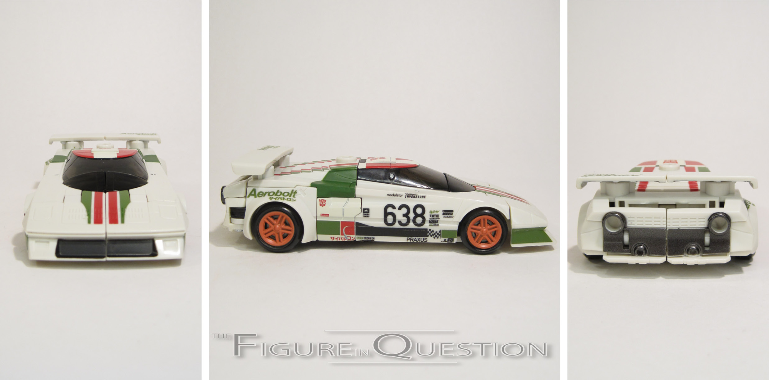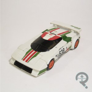 articulation isn’t as great as it could be. On the plus side, the range on the legs is actually really good, especially on the ankles, which go two different ways, unlike most of the modern ‘formers. Wheeljack’s alt-mode is a race car, much like his vintage counterpart. Like Cliffjumper, however, it’s not a specific model, and is more of an averaged design. It still has a real world feel. The transformation process is pretty simple and straightforward, provided you don’t have parts spontaneously pop off in the midst of it, like I did. It’s okay, everything went back the way it was supposed to. Wheeljack is packed with his shoulder launcher, which the box art and the product shots show him holding in his hand, which I believe Max would like me to point out is an affront to God, or Primus, or something.