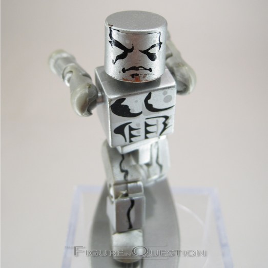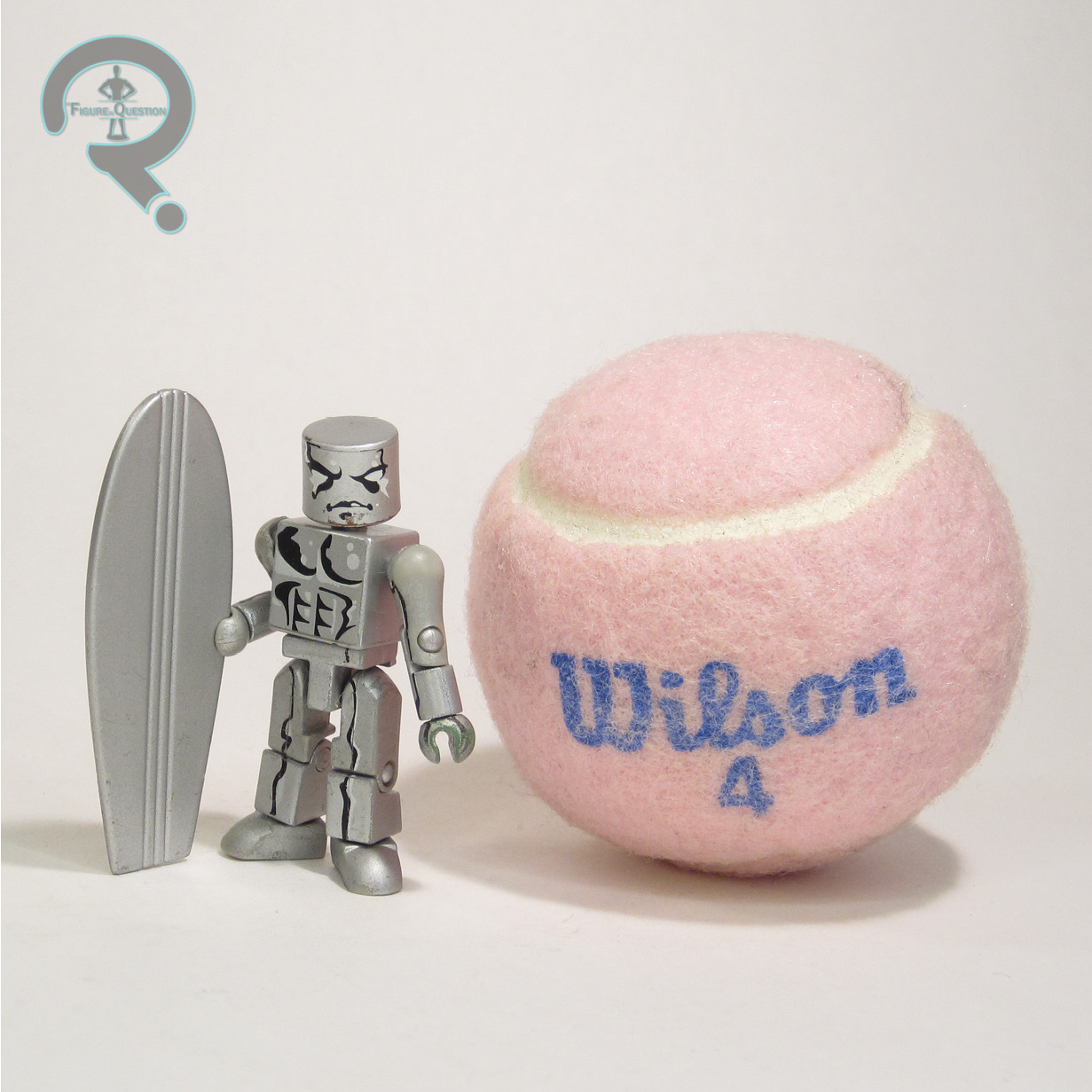 Silver Surfer was initially released in the Marvel Minimates line on his own as a Tower Records-exclusive, then surfaced in one of the TRU four-packs, then the TRU ten-pack, then in series 7 of the main line alongside Spider-Man 2099, and then finally in an Action Figure Xpress-exclusive two-pack with Thanos. Apart from the AFX version getting C3-style feet, the figures were all the same, making him a relatively easy to acquire ‘mate, at least for a good while. Surfer was, and continues to be with more recent offerings, a vanilla ‘mate, relying only on the basic ‘mate body to make him work. As such he stands 2 1/4 inches tall and has 14 points of articulation. The heavy lifting here was done via the paint, and while you could go *really* basic on a character like this, DST actually put some care into his detailing, attempting to capture the comics’ style of making him look extra shiny. There’s more of a minimalist bend to this one, going more for a “suggest but don’t explicitly outline” approach to most of his features. Contrasted against the far more line-work heavy designs of the later Surfers, I can’t help but just really dig this one for the simplicity of it all, even if the paint on mine has taken quite a beating over the years. Surfer’s one accessory is his board, which for this version is just a board, with no pegs or anything on it. It’s a little limiting in regards to what you can do with it, but it also means it’s not marred by the connection points that were all over the later versions.