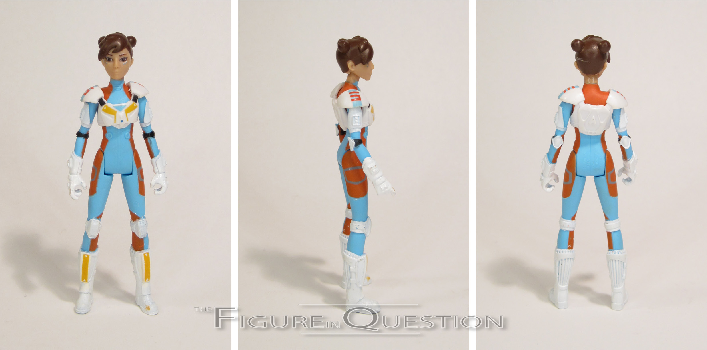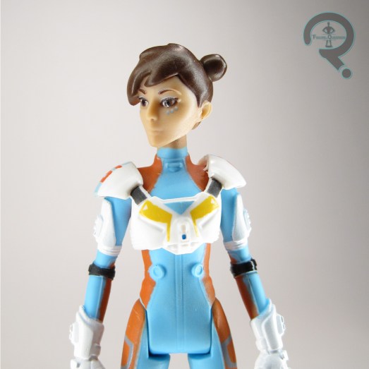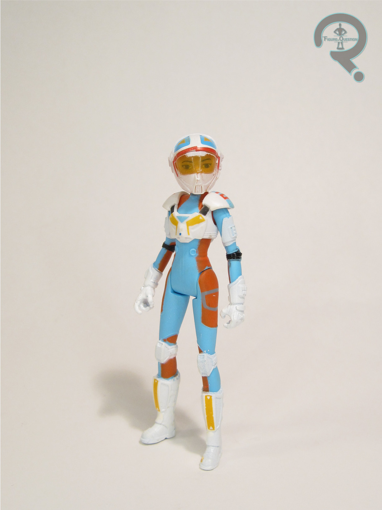 Torra Doza is another basic figure from the first (and only) assortment of Star Wars Resistance figures. She stands 3 1/2 inches tall and has 5 points of articulation. Torra’s sculpt is all-new to her, and like the others I’ve looked at so far, it’s a pretty spot-on recreation of her animation model from the show. It’s not quite as sharp a sculpt as Kaz’s, but it’s still got some pretty cool little details going into it, especially on the boots and gloves. The rest of the details are very clean looking, and the figure’s certainly quite slick. Rather than getting a removable helmet (which would no doubt be quite difficult with her hair), Torra has a second head, with the helmet permanently attached. It’s fairly nice, but the presence of the eyes makes it look really weird if you have her holding it while unmasked. Torra’s paintwork is quite colorful, as is the case with most of the Resistance figures. I appreciate the very bright colors, as they aren’t always as common with Star Wars figures. The application on the head is very sharp, but the body suffers a bit. In particular, on my figure the paint on her neck is mostly covered by the blue of the jumpsuit, rather than being the appropriate flesh tone. Though her hand appears to be molded for a blaster of some sort, Torra’s only accessory is the previously mentioned helmeted head. It feels a little light, and is made worse by the fact that she’s yet another pilot without a ship to fly.