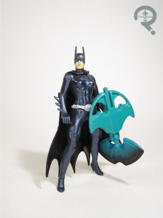 Batgirl was released in the first wave of Batman & Robin product from Kenner, hitting shelves in 1997 to tie-in with the film. Unlike the various Batmen and Robins, she didn’t get any sort of adjective in front of her name; she’s simply “Batgirl.” Man, no goofy Kenner name is just a bummer. Did they even try with Batgirl in this thing? Oh, right, I’ve seen the movie: the answer is “no.” The figure stands 4 3/4 inches tall and she has 5 points of articulation. So, right off the bat (heh), let’s address the inaccuracies of the figure. As I brought up in my Robin review, the whole Batman & Robin process was quite expedited, so the figures were working from early costume designs. In Robin’s case, that was all well and good, because he kept his design, but in Batgirl’s case, that means she’s a bit off from her film appearance. The big change is the full cowl in place of the domino mask she was sporting in the final product. It’s not a particularly attractive design, at least as implemented on the figure. She’s also got the wrong version of the bat symbol, and is missing a lot of the ribbing and such that ran throughout the body suit, making for a much more basic looking design. There is also a removable cape, which actually is a pretty decently designed piece. Her paintwork is fairly basic stuff. She’s rather monochromatic, but that’s honestly a bit more faithful to the film than most of the color schemes to come out of this movie. Batgirl was packed with a “Battle Blade Blaster” and “Strike Scythe,” which are the weird green and black things. They don’t correlate to anything in the movie, but they certainly exist, now don’t they?