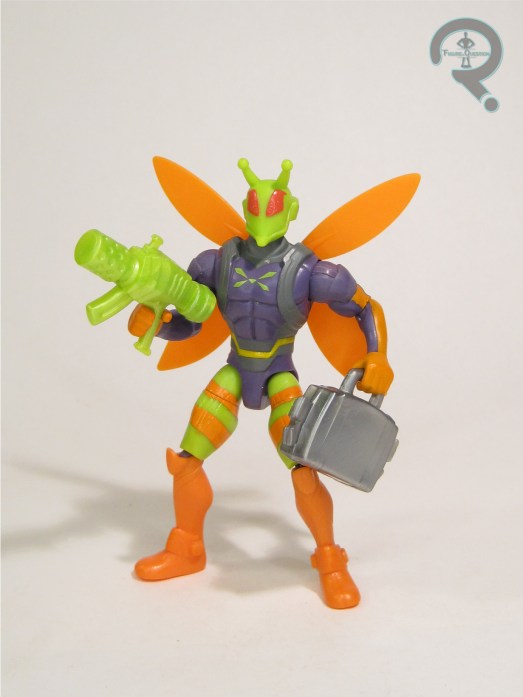 Killer Moth is part of the second assortment of Spin Master’s Batman: The Caped Crusader toyline. He’s one of two “new” figures in the line-up, the other being Batwoman. Killer Moth has had a few rather differing appearances over the years; this figure’s main inspiration is clearly his original ’60s get-up, in all its garish glory, though it seems to have gotten a bit of an update. The figure stands about 3 3/4 inches tall and he has 17 points of articulation. On my figure, the neck joint is rather stuck, so I haven’t been able to really get any motion out of it, for fear of tearing the ball clear off. Hopefully that’s not a wide spread issue. Killer Moth gets an all-new sculpt, which is just downright shocking, because typically the main thing he’s got going for him is the ease of building him on a buck body. This one, however, has quite a few character specific elements built into it. Sculpturally, he looks to have taken a lot of influence from Batman: Bad Blood‘s incarnation of the character. It’s a sleek and modern update on the classic jumpsuit with a harness and a helmet. This one feels a little more cohesive and put together. I definitely dig it. The color scheme marks the major change-up from that design. In the film, it’s mostly all black, but this figure gives Moth the classic color scheme I mentioned above. Why’s a moth guy orange, green, and purple? No idea, but I sure do love it. The application’s all pretty solid, and the whole thing just really works. Killer Moth’s blind-packed accessories include a gun in neon green, a briefcase in silver, and a chest piece, which mine does not have. I’m pretty sure it did have that piece originally, but by the time it came to me, said piece was gone.