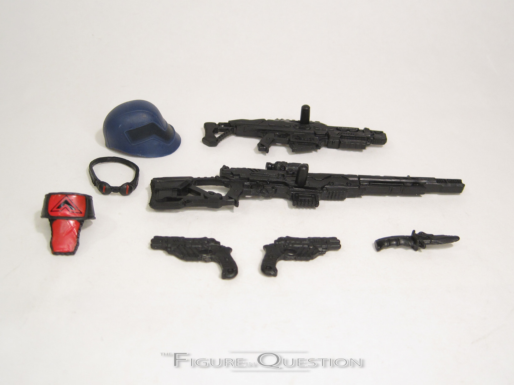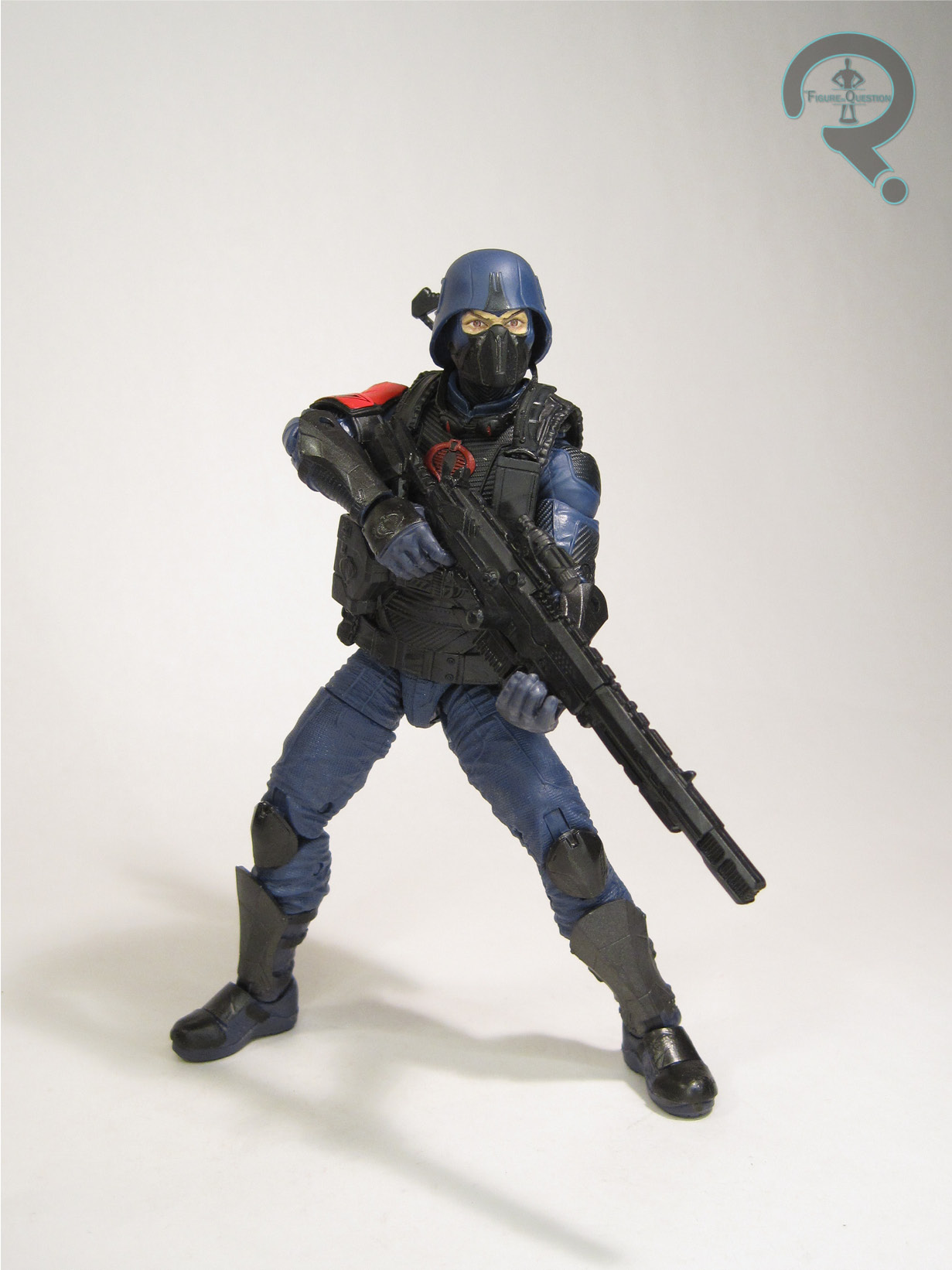 sculpts (though I think Beach Head still edges him out in my book). The paint work is about what you’d expect from Cobra forces. There’s a lot of blue and black, with just a hint of red. This version in particular has more black than usual, which doesn’t look bad, but is certainly different. This particular version of the Cobra Trooper has quite the accessory selection, with the removable helmet, a set of goggles, a removable arm band to give him a higher rank, standard and sniper rifles, two pistols, and a knife. Everything can actually be stored on the figure at once, which is quite impressive, especially since it doesn’t require him to be holding one of the rifles like most Joes fall back on. I dig the customization angle that all of these parts give the figure for sure, though I myself am drawn to a rather “standard” trooper set up.