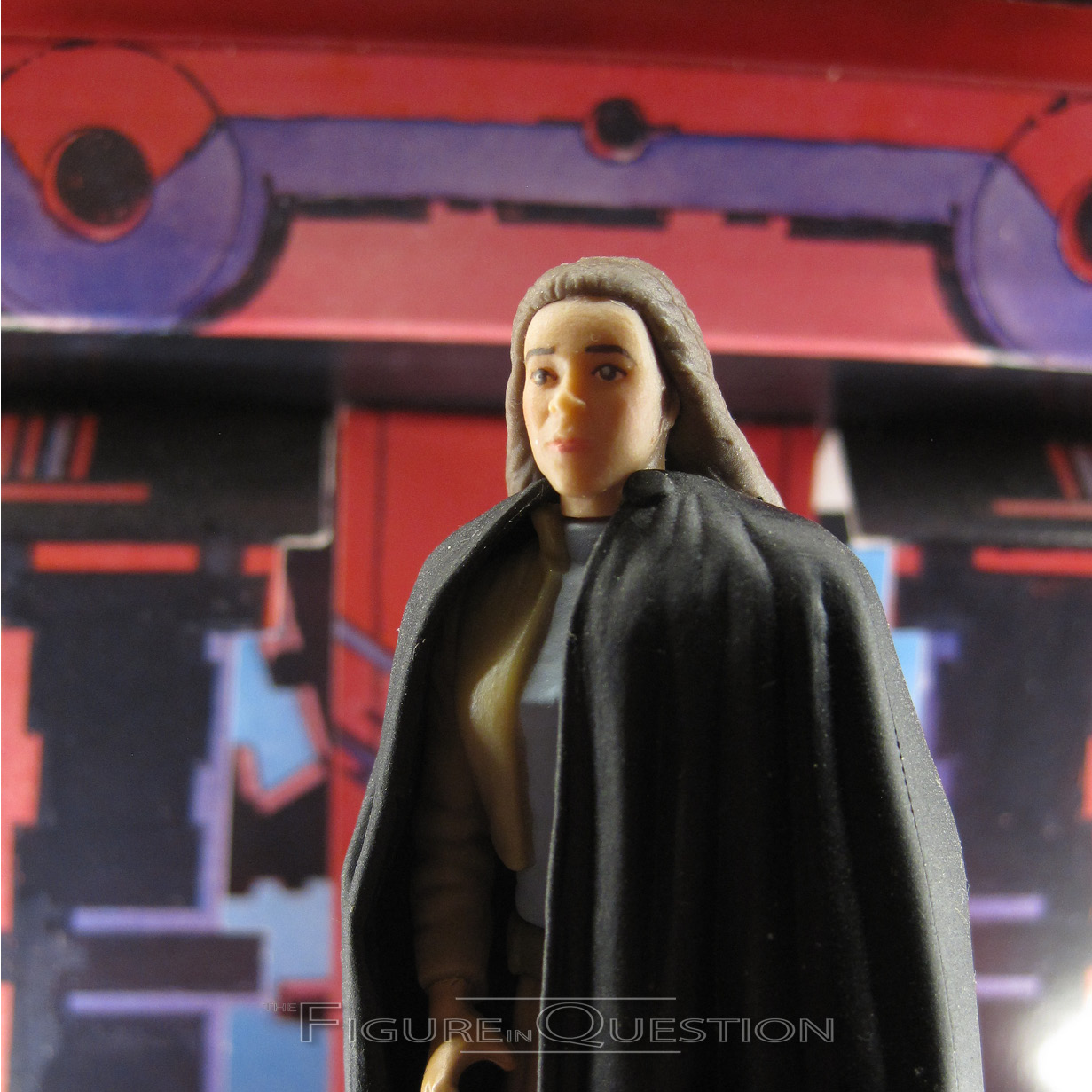 Princess Leia from Dark Empire was part of the first seven figures in what would eventually be a nine figure line-up of the Expanded Universe sub-line. She, like most of the EU figures, proved a bit scarce at the time of release, and honestly hasn’t ever reached the same level of plentifulness as other PotF figures. The figure stands 3 1/2 inches tall and she has 6 points of articulation. Leia is an all-new sculpt, patterned on her more action-faring design from the comics. It’s an interesting design set-up. She adds a Jedi-Luke-esque cape to her attire, and beneath it she’s got something that looks akin to Luke’s Bespin gear. It’s definitely helps to solidify the more traditional protagonist role Leia falls into during the course of the story. It’s a pretty decent sculpt overall. It’s rather in keeping with the rest of the mid-line Leia sculpts from PotF, with a likeness that’s consistent with those other figures, making it easy to tell she’s supposed to be the same person. The figure has a little bit of trouble standing without the cape, but with it on she keeps up just well. And honestly, who’s not going to use the cape? It’s so cool. Leia’s paint work is, like the other EU figures, a touch more vibrant than the usual Star Wars fare. Of all of them, she’s certainly less removed than others, but I do certainly enjoy the multitude of colors used on her cape. It’s a very nice touch. Leia is packed with a light saber (in a rather concerning red, to match her brother), and a small blaster. And, like all of the single-carded EU figures, her card back also unfolds into a small 3D back drop for her, based on the comics. This is consistently my favorite part of these figures.