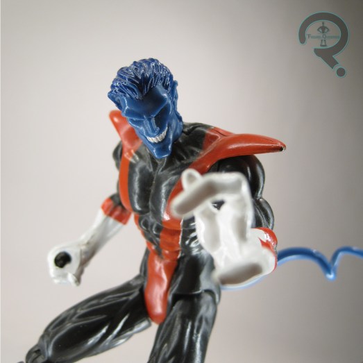 Nightcrawler was released in the above mentioned “Classic Light Up Weapons” set of Toy Biz’s X-Men in mid-1996. It marked his second inclusion in the line, after a rather lengthy hiatus following his Series 1 inclusion. The figure stands about 5 1/4 inches tall and he has 10 points of articulation. Like the others in this assortment, his light up feature hampers the movement on his right arm, and his left removes the usual elbow joint in order to more properly match-up. He does, however, gain ankle joint movement, which is quite useful for him, as well as an additional cut joint at the base of the tail (which is not bendable this time). Nightcrawler gained an entirely new sculpt for this figure, and one more in line with the line’s stylings by this point. It’s not bad, but it’s definitely removed from the more classic interpretations of Kurt I tend to prefer. It also makes him a bit taller than he really should be, as well as amping up the definition in his muscles. At least he wasn’t as majorly bulked up as the other male figures in the set. Nightcrawler’s paint work is generally pretty decently handled, with all the usual colors. There was a variant of this figure with less of the usual colors, which swapped out silver for the spots that are usually red. It was an odd color variant, but it was there. It’s not one of the one’s I have, though. Nightcrawler’s only accessory was a sword, which was also the source of most of his gimmick, as it wasn’t just any sword: it was a flaming sword. Pretty nifty, and definitely on the better front as far as the light-up accessories for this set went.