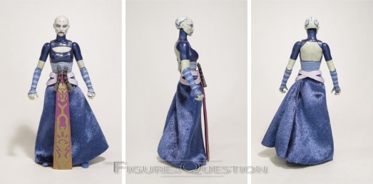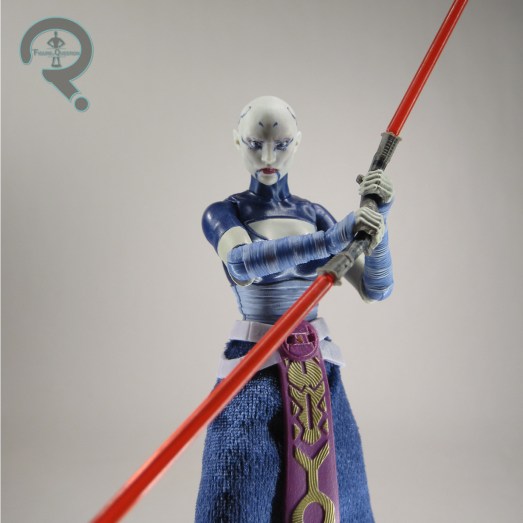 pretty nice piece of work. She ranks very highly on the list of translations from animation style to realistic. She maintains the overall likeness of the character, but still looks like a really person. The detailing on her outfit is pretty sharp, with the best work definitely going into the wraps on her arms and mid-section. The construction on the skirt works pretty much the same as the smaller Clone Wars version; the bulk of it’s cloth, with the belt and tabard being plastic. I quite like the cloth they’ve picked for the skirt itself; it hangs well, at the sheen looks quite slick in photos. Asajj’s paint work is pretty solid work overall. The face uses the printing tech that’s become the norm for the line, which works well here. The rest of the detail work is fairly clean, and she doesn’t seem to be lacking any notable coverage. Asajj is packed with her two curved-handled lightsabers, which she can hold (slightly incorrectly), or keep on her belt. They can also be combined into one thing, which is kinda awkward, but also is accurate, so good on them for keeping that detail. Just the two sabers does feel maybe a bit light, but I don’t know what else you could giver her, really.