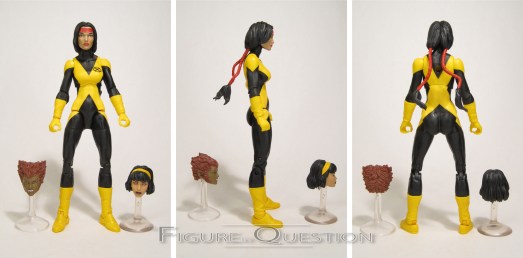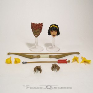 Dani’s look from the comics, but there’s a decent reason it’s not: because this figure’s designed to be more than just Dani. She includes two extra heads, as well as two extra sets of hands, which allow her to be displayed as her team-mates Karma and Wolfsbane, also in their mid-00s team suits. The heads are pretty nice pieces themselves, and the overall appearance works out way more convincingly than, say, the Lilandra head included with Mystique, so there’s more out of the box value here. In terms of paint work, the figure’s overall pretty basic. The work on the suit is nice and clean, and the individual heads all feel sufficiently distinct from each other in terms of how they handle the palette and themes of the characters. In addition to the whole extra set of head and hands for the two separate characters, Dani does also get a couple of accessories of her own, namely a bow and a single arrow, which both appear to be new pieces, as near as I can tell. She has a little trouble holding the arrow, but it’s still a good look overall.