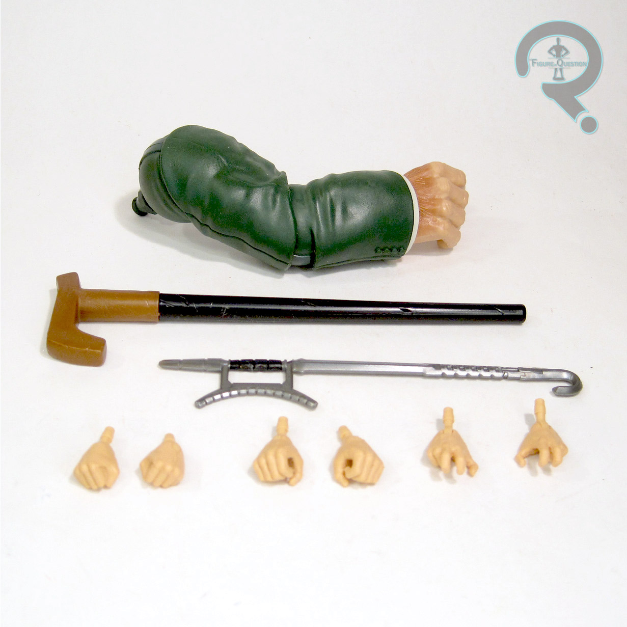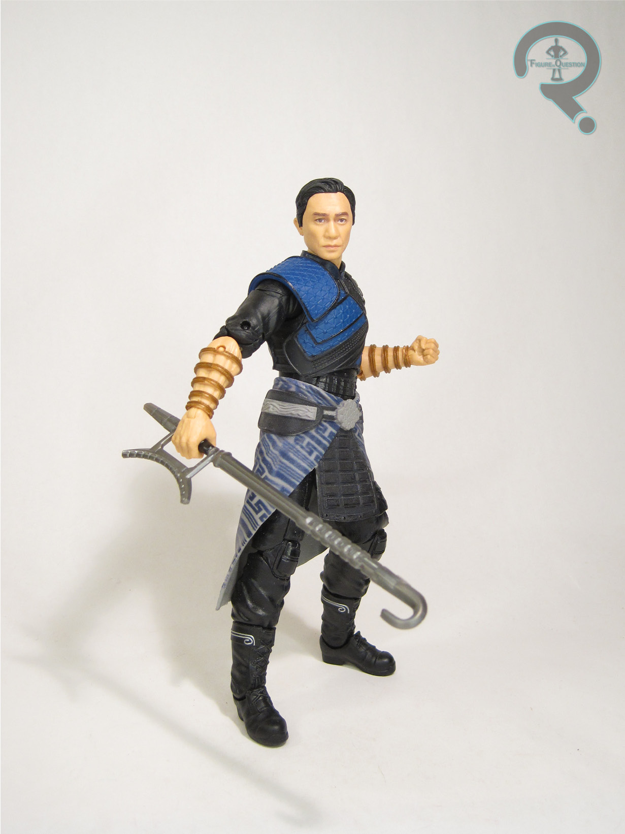 design element. Wenwu’s sculpt is a very impressive piece of work. The outfit is intricately detailed, and even more involved than Shang-Chi’s. There are a lot of layers, and it looks quite sharp. The head actually has a pretty respectable likeness of Wenwu’s actor Tony Chiu-Wai Leung, and is certainly a marked improvement over the Shang-Chi likeness. Wenwu’s paint work is generally pretty decent. The application’s all clean, and the colors seem to match up with what we’re going to be seeing on screen. The blue still takes a little getting used to for me, but I don’t dislike it. It’s just definitely a slight change of pace for the Mandarin. Wenwu is packed with three sets of hands (gripping, open gesture, and fists), a hook sword, and the right arm and cane for the Mr. Hyde Build-A-Figure. Yay for actually getting fists with this one!