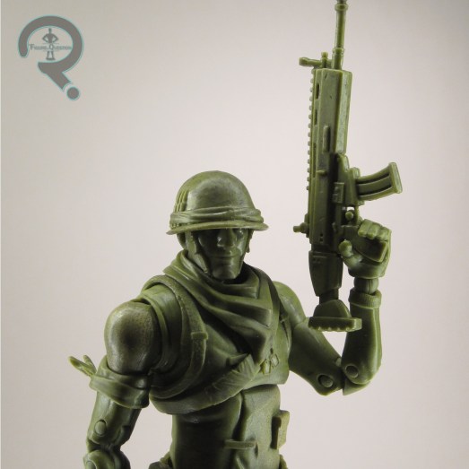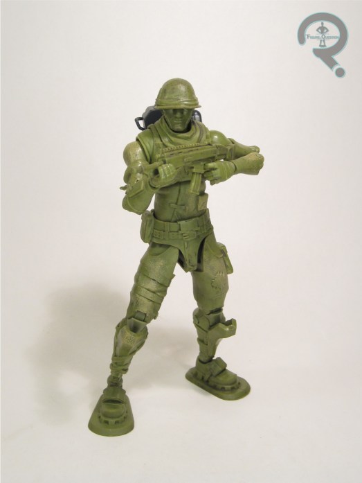 The Plastic Patroller was added to McFarlane’s Fortnite line early this year. The figure stands 7 1/4 inches tall and he has 35 points of articulation. Comparing the two toymakers’ lines, I don’t find the McFarlane offerings to be quite as easily posed, at least going by this particular figure, but I don’t think it’s a bad set-up. It’s on par with the DC stuff, so it’s certainly much better than what Todd used to do. In-game, the Patroller is largely a recoloring of the Jonesy skin, so this figure is unsurprisingly built on a lot of the same parts as the McFarlane Jonesy. It’s a decent enough starting point. I’m super crazy about how the ankles and wrists look, but for the most part it works. I also did find it interesting that the trigger finger is on the left side, which isn’t very common. That I definitely don’t mind, though. He does get a new head and feet, though, in order to give him both the helmet, and the excess plastic at the feet, to help really sell that green army man feel. The helmet does maybe feel a little to joined to the head and not a distinctly different part, based on the animation model, but it’s not terrible, and does still feel like the old toy, so it still works. The extra stuff on the feet actually