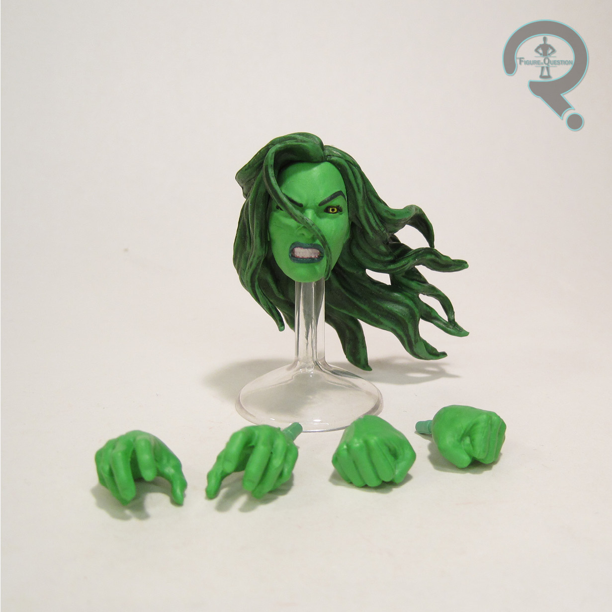 She-Hulk is a stand-alone Fan Chanel-exclusive Marvel Legends release, much like the run of them we got at the end of 2019. She’s in the standard style packaging, just without the Build-A-Figure part. This figure’s definitely most inspired by the character’s earlier appearances, while she was still in her “Savage She-Hulk” days, hence the more mainline Hulk-esque tattered clothes. The figure stands 7 inches tall and she has 29 points of articulation. She’s built from the same bank of parts as the Super Skrull Series Hulk, which is sensible enough. It was an all-new sculpt, and I can definitely understand Hasbro wanting to get some more mileage out of it. It’s not a pitch-perfect match for any of the specifically She-Hulk looks, but it’s close enough to work. It’s also just a very nice sculpt, so I’m not gonna knock seeing it another time. She’s got a new head sculpt, which is notably calmer and more composed, in keeping with the majority of She-Hulk’s appearances over the years. It’s not bad, though it does feel maybe a little bit bland for my taste, at least when compared to the previous sculpt, which was very dynamic. Fortunately, if you preferred that sculpt, it’s also included here, so you’re free to swap them out as you please. In addition to the extra head, the other change-up for this figure is the color scheme.