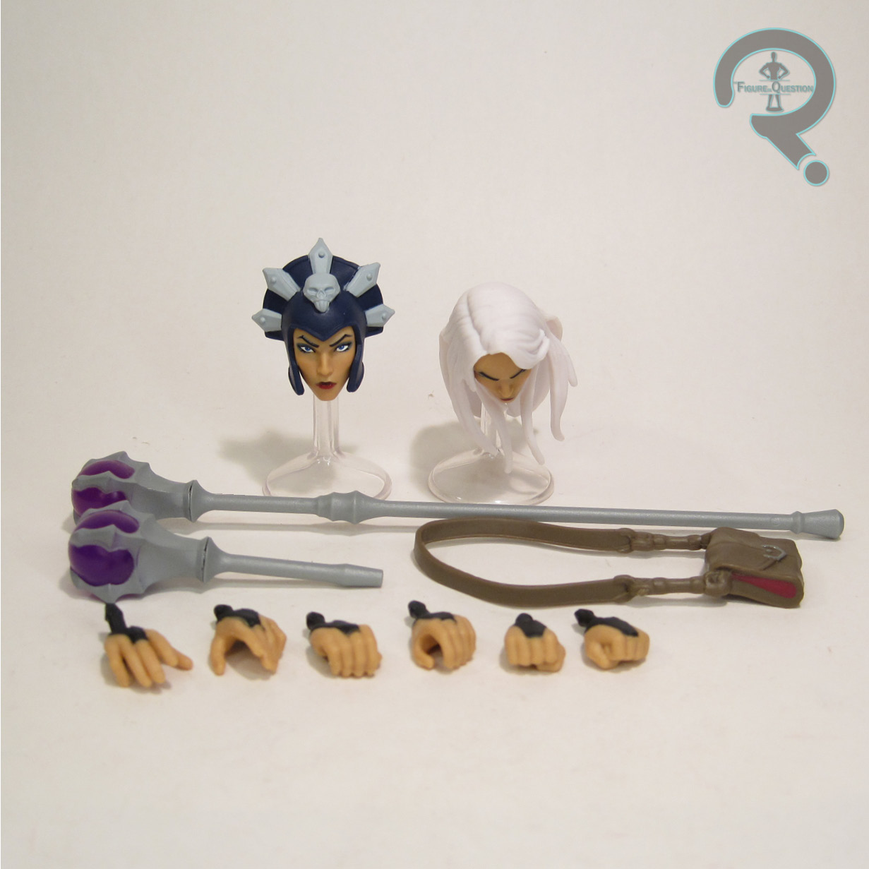 going to see a lot of re-use on the upcoming Teela figure. It’s a bit closer to the Classics aesthetic than the male body was, but it’s still a little slimmer, in keeping with the show’s animation style. Since she’s a fair bit more clothed than He-Man was, that gives her sculpt a little bit more to do, making it a little sharper, and giving it the chance to showcase a little bit of texture work. Evil-Lyn’s main head is wearing her usual headdress, which is a separate piece, giving it a little more depth. It’s a nice piece, as is the underlying head, which has a pretty decent Evil-Lyn likeness from the show. Much like with the sculpt, Evil-Lyn’s more involved outfit gives the paint a little bit more to do. The application is all pretty sharp and clean, and she generally looks pretty decent. Evil-Lyn has quite an impressive selection of accessories, with an alternate head without the headdress, her staff in both long and short set-ups (a great callback to the vintage line from the show, by the way), a satchel, and three sets of hands (in fists, gripping, and open gesture). Compared to He-Man, it’s a very impressive offering.