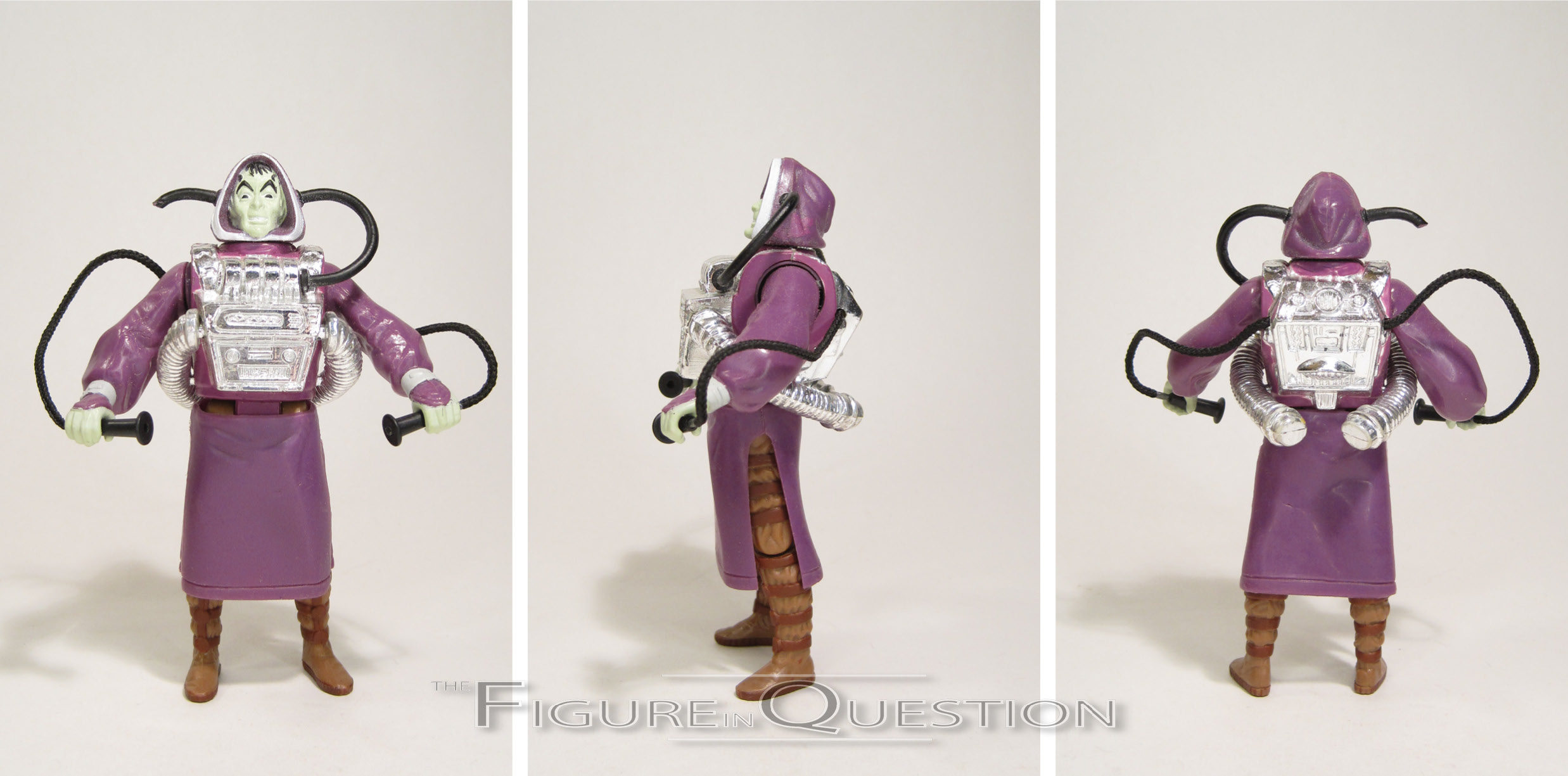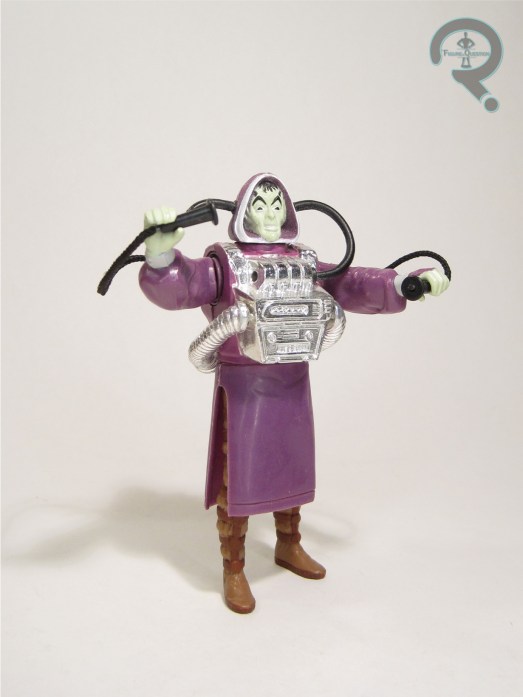 DeSaad was added to Kenner’s Super Powers line in its second year in 1986, getting the first of his two figures to date. The figure stands 4 1/2 inches tall and he has 7 points of articulation…sort of. Depending on how you look at it, it could be a little more, but also a little less. The shoulders do have some butterfly motion, but it’s totally tied to his action feature. Moreover, the hips are restricted by the skirt piece, the neck is restricted by the tubes on the head, and the shoulders are restricted by the device on his chest. Lotta restricting going on there. This is definitely one more for just kind of standing there. DeSaad’s design in the comics is pretty basic; he’s a small scrawny guy in a purple cloak. This one isn’t too far removed from that at its starting point, but then also adds the weird contraption on his chest, which does give him a little more flair, to be fair. The device, along with the tubes running to it from his head, are unfortunately quite prone to breaking, which is why one of the tubes on mine is in such a state. Otherwise, it’s not a terrible piece of work. He looks suitably creepy, and the detailing on the outfit does get pretty involved, which is cool. His paint work’s not bad. Fairly nuanced compared to others in the line, with a sickly green skin tone, and some subtle accenting on the legs and cloak. Generally, it looks pretty solid. DeSaad’s gimmick is a “Power Action Shock Squeeze.” Squeezing his legs moves his arms in closer to his center.