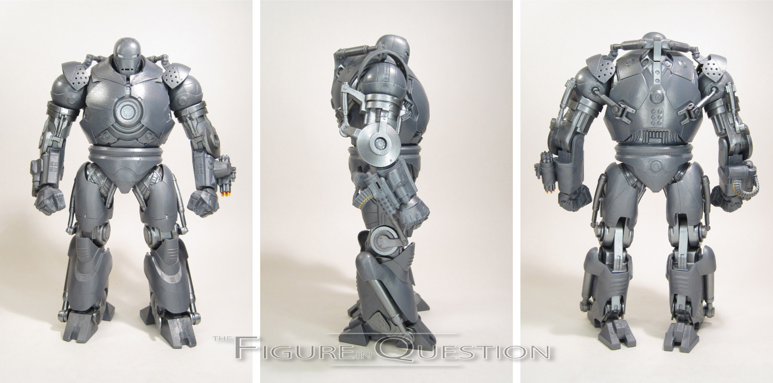 figure is pretty decently handled as well. There are a few moving pistons, which don’t quite work as real ones would, but do move to properly allow for posing the figure, and also add some extra depth of detail to the design. The head and torso also make use of multi-piece construction to add some extra depth to what’s visible of internal mechanisms and the eyes and reactor. I quite like the clear dome over the reactor in particular. There’s a part of me that kind of wishes they’d worked in the opening hatch as seen in the film, but I get the extra logistics involved might have caused some issues. You can kind of cheat it by popping the Obadiah head on there, so it’s not a total loss. Iron Monger’s paint work is largely rather basic, since so much of him is just unpainted silver plastic. There’s a fair bit of actual painted silver as well, though, which mixes up things. Additionally, the paint for the reactor, as well as the weapons on the arms, is all pretty cleanly applied, and makes for a nice little splash of color on the otherwise sort of drab design. Iron Monger is packed with two sets of hands (fists and open gesture), as well as two separate effects pieces for the gun attachment on the arm, a rocket for his back, and an ammo belt. Certainly not a bad selection of extras in the slightest.