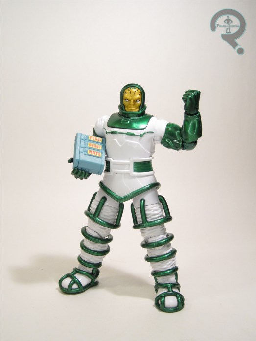 Psycho-Man is part of the FF-themed Retro Collection assortment of Marvel Legends. He fits in pretty perfectly, since his only other figure was during Toy Biz’s original FF line, which these figures are homaging. The figure stands 6 1/2 inches tall and sports 28 points of articulation. His articulation scheme is actually quite impressive given his overall bulk. The use of ball joints at the neck and mid-torso really give him a nice range, as do the double joints at the elbows and knees. He’s also using the pinless construction again, which looks nice and sleek. Psycho-Man’s sculpt is a completely new offering, and it’s a pretty nice one at that. It’s definitely going more for the Byrne take on Psycho-Man, which is fitting with the theme, and also just the better take on the character, I feel. It’s a clean, sleek, and very technically impressive. He’s only got the one set of hands, which has become a rarity these days. They’re a decent combo as well, at least in terms of posing options and the like. Psycho-Man’s paint work is pretty straight forward, with the colors being largely reliant on molded plastic. It all works very well, and I really love the metallic green. He’s packed with only one accessory: his Control Box, the thing that allows him to control other people’s emotions. It’s a rather basic piece, but still a rather fun one. At least he got something, and this does work quit well with his right hand pose, allowing it to be carried under his arm.