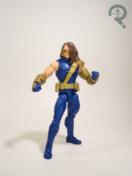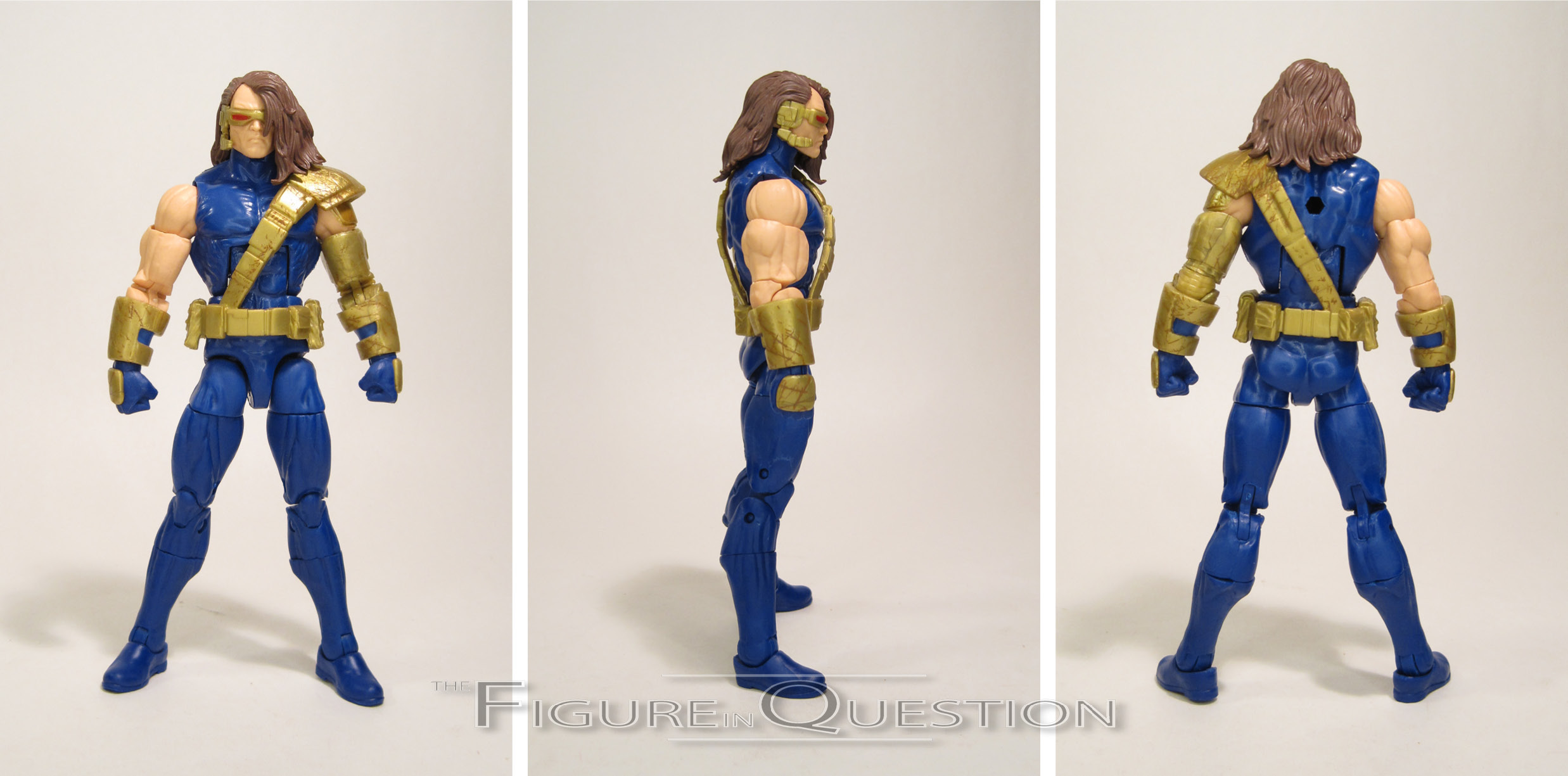 out to be, but the important elements of the design are all present, and his features are also internally consistent with the other Cyclops figures from the line. His new arms bulk him up a little bit more compared to the standard Bucky Cap pieces, as well as transitioning him to the pinless construction on the elbows. Some of his articulation is lost on said elbows, which can really only make it about 90 degrees. It’s understandable given the nature of the design. Cyclops’ paint is generally very basic. Much of the color work is just molded plastic, and it’s honestly a pretty basic layout of colors for the costume anyway. Kudos to Hasbro, though, they did actually do some weathering and wear on the gold armored parts, which looks pretty solid. Cyclops includes no accessories of his own, which is kind of a shame. A blast effect, or an alternate head, maybe with the hair swept back to better show off the missing eye and scarring, would have been pretty cool. All he winds up getting is the left leg for Colossus, which definitely feels light compared to pretty much everyone else.