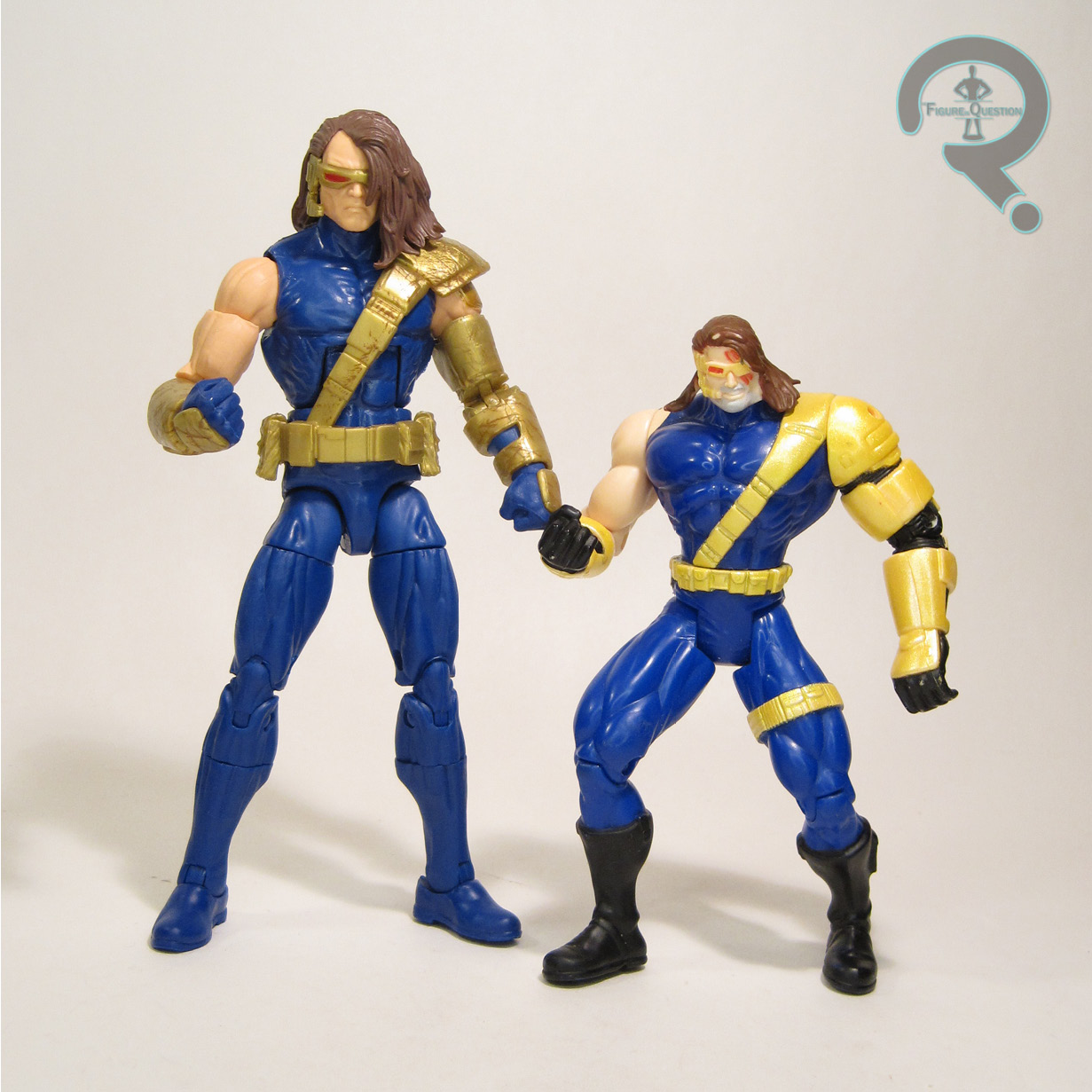 Cyclops is figure 2 in the Colossus Series of Marvel Legends. Though far from the first Legends Cyclops, it’s still the first Legends release for AoA, and the third figure for the AoA design overall. The figure stands 6 1/4 inches tall and he has 32 points of articulation. Cyclops is built on the Bucky Cap base body, which has been the consistent choice of base for Cyclops since the Puck Series version. The AoA version has at times been depicted as a little larger in build, but that can be chalked up to artistic license, and thus far all of the other AoA variants have maintained consistency with their main counterparts in terms of body choices. I mean, that’s gonna sort of fall apart as we make it further into the assortment, but we’ll stand by it here. Ultimately, I really don’t mind it. He gets a new head, arms, and an overlay piece for his belt/shoulder strap. The head’s not quite as extreme and 90s-tastic as some of the illustrations made him