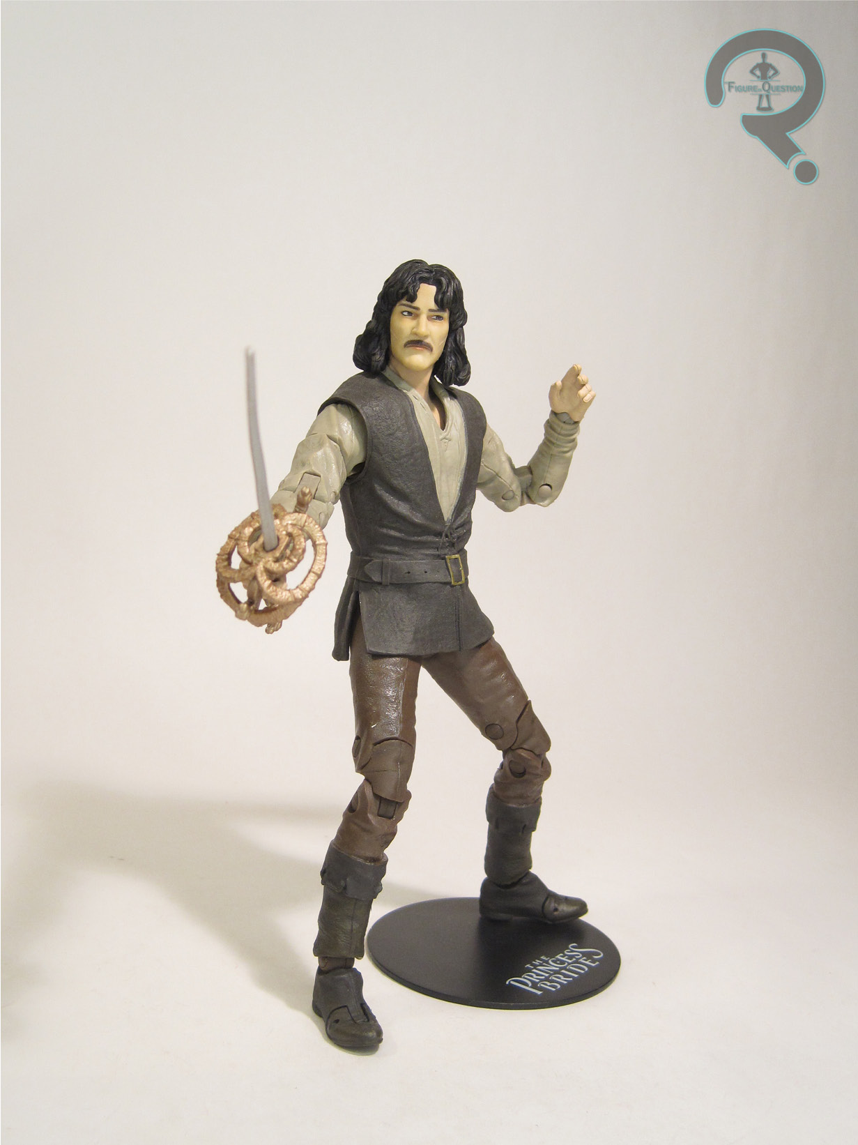 likeness of Mandy Patinkin; it’s a bit caricature, but it’s fairly easily recognized. The more dour expression certainly works here, and they’ve even remembered to include the scars on his cheeks. The hair is a little thick and un-hair-like, but it gets the proper shaping, which certainly is the most important thing. Inigo’s paint work is honestly the best of the bunch. It’s still rather basic, but there’s enough detailing to make it work. Curiously, despite Inigo generally being scruffier than Westley, this figure doesn’t get stuck with the heavy shadowing on the lower half of the face, or any scruff at all, actually. I think it works in his favor, and the rest of the face detailing is pretty solid. I like the slight shading under his eyes. The two things I don’t like are the fact that the shoulder cups are molded in flesh tone, revealing the clashing color scheme when he’s posed, and, as with all of the figures, the dreaded side-eye. As with Westley, he’s looking the opposite direction of his sword hand, and, just like Westley, this further emphasizes the general stupidness of not including alternate left hands for these two. He does include his rather ornate sword, as well as a display stand.
