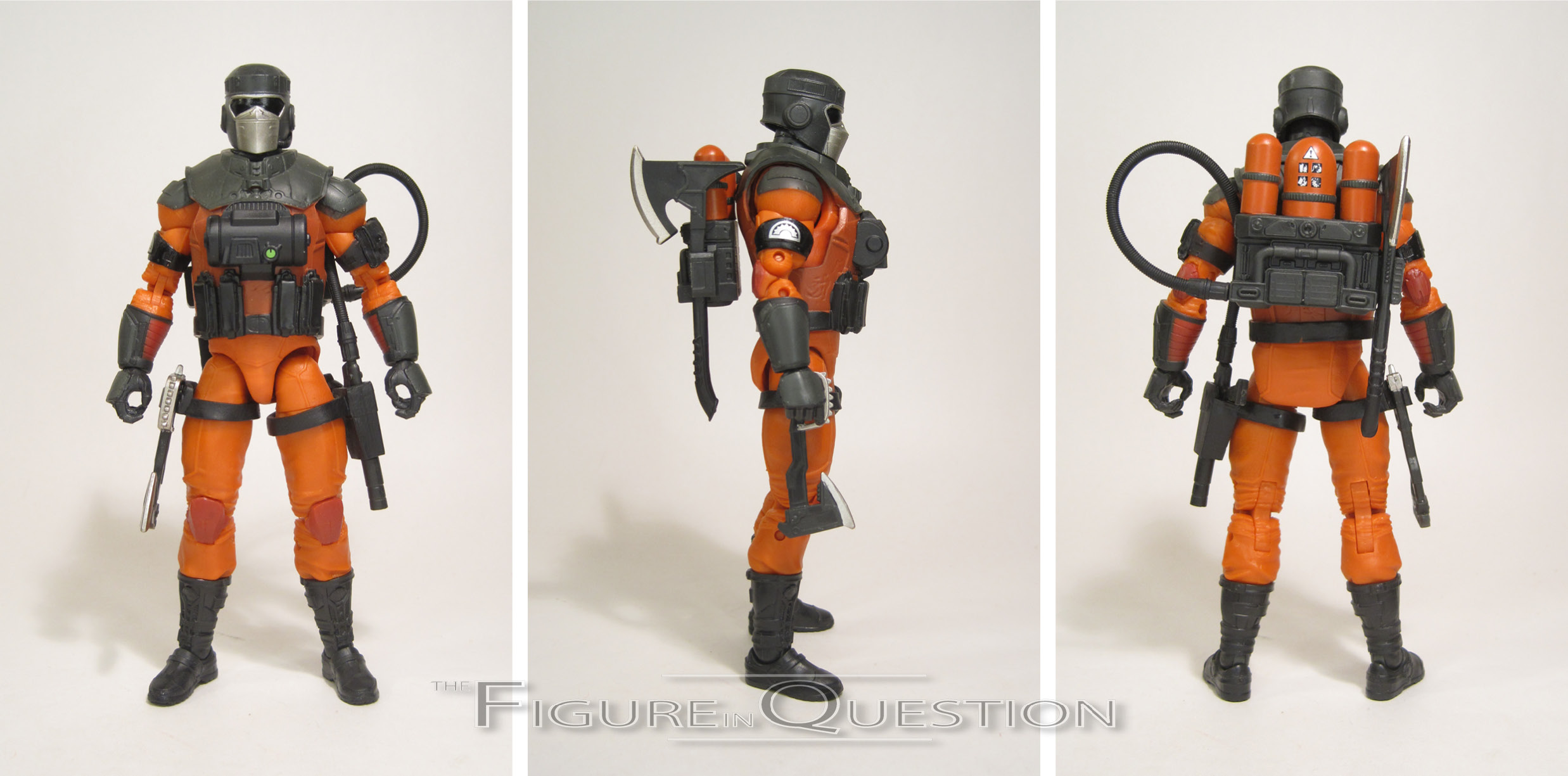 modernize him ever so slightly, and also fill in the visual space just a little bit more at the larger scale. He gets a little more armoring on the shoulders and wrists, as well as a little more tactical gear around the middle. The helmet is a particularly cool piece; it very faithful to the original design, while sharpening things up just a little bit, and also adding some smaller details, again to help with fill in that extra visual space. Barbecue’s paint work is generally pretty basic; it matches up with his established color scheme quite well, and the application is all pretty sharp. I wouldn’t mind seeing maybe a few other smaller details worked in, but he checks all of the basics off, which is still pretty solid. Barbecue is packed with his classic backpack, hose attachment, and spray gun, as well as a smaller axe based on the one included with the original figure, and an all-new larger axe piece. The smaller axe and spray gun are able to be holstered on the legs, and the larger axe has a spot on the backpack. The ones on the legs work well, but the backpack one isn’t quite as practical. That said, it’s nice to see them still try to give everything proper storage.