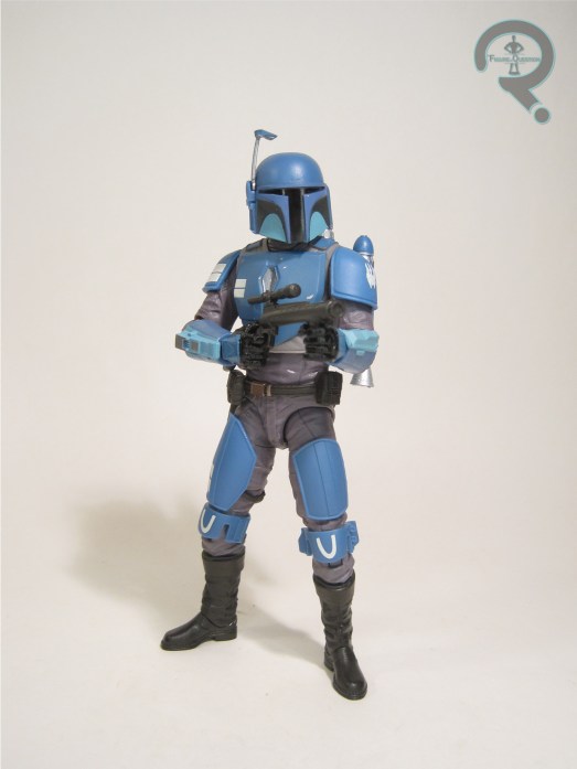 an all-new sculpt. At first glance, he appears to share the head/helmet with Boba, but this one’s actually a single solid piece, with no actual underlying head. There’s a chin and such sculpted under there, but it’s not fully designed. I suppose there’s no real need for it to be a separate piece if there’s no chance of ever taking it off. The rest of the body sculpt is pretty nicely handled. The armor plates are separate pieces mounted in place, which gives it a nice, properly assembled feel. The paint work on the Death Watch Mando is a decent set-up. He’s much cleaner than a lot of Mandos, but that’s accurate to what we see on-screen; guess they had more time for armor upkeep in those days. It’s a cool color scheme, which is rather unique. I very much dig all of the blues. The figure is packed with a larger blaster rifle and a small blaster pistol, which are both pretty fun pieces, as well as a jet-pack, which appears to be an all-new one, different from the others we’ve seen.