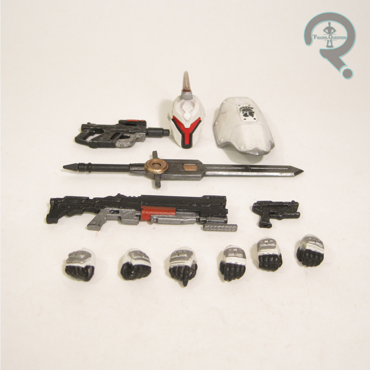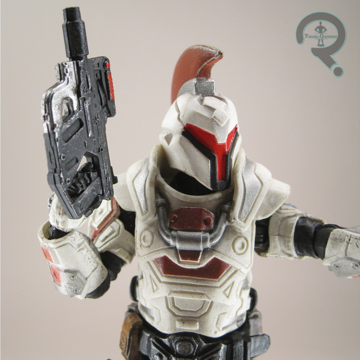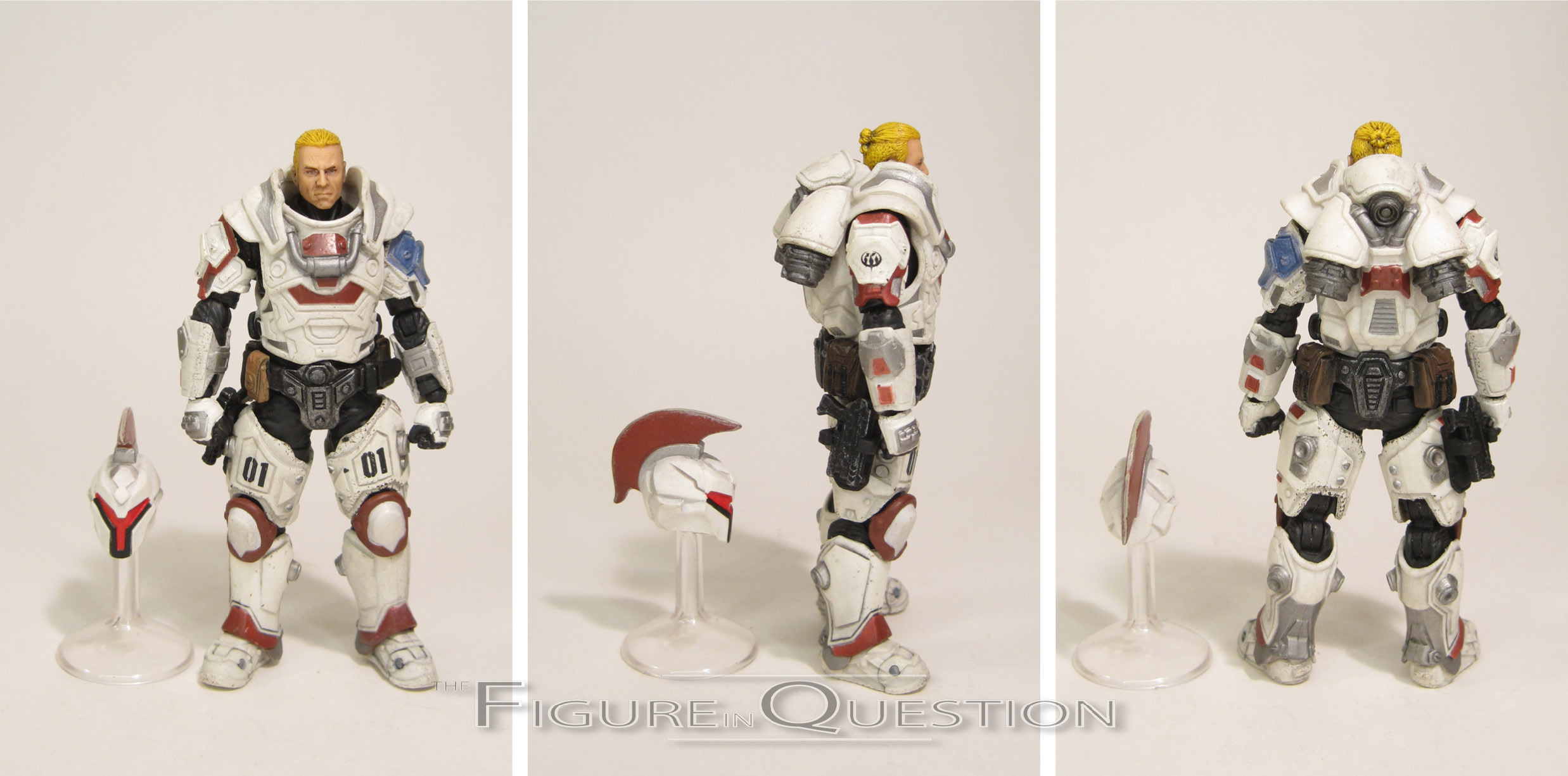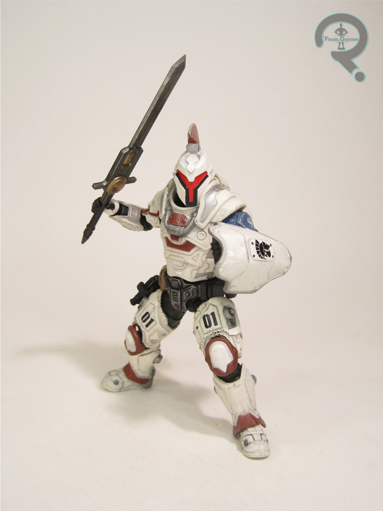 mean that in a historical sense, not a Halo one) influence of the design. It’s very clean and classically heroic, and it just meshes very well with the rest of the armor. Under the helmet is a full unmasked sculpt. It’s rather grizzled, and there’s plenty of detailing. I’m not big on the top-knot, but it’s an alright sculpt on the technical side. What really makes each of the 1st Steel Legion figures shine is their unique color scheme. Ice Sword is predominantly white, as you might expect from someone with “Ice” in their name, though he gets some red detailing, as well as just a splash of blue. It gives him a vaguely Captain America-esque feel, at least to me. The paint work on this guy is pretty solid overall. There’s a little bit of bleed over on some of the edges, but nothing major, and the work on the insignias and markings is all nice and sharp. There’s a little bit of a wash on the armor, so that it looks a little broken-in, but it’s not too overpowering. Ice Sword is packed with a sword (rather unsurprisingly), a shotgun, a small machine gun, a pistol, a small shield, and three sets of hands (in fists, loose grip, and tight grip). It’s an impressive selection, especially when compared to the last 1/18 figure I looked at from the line.