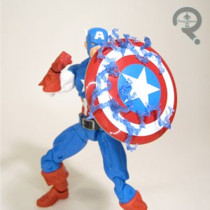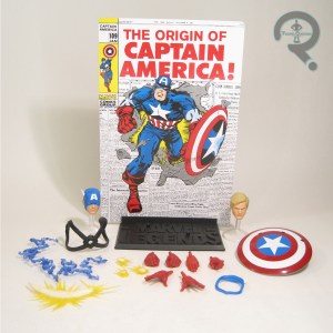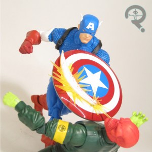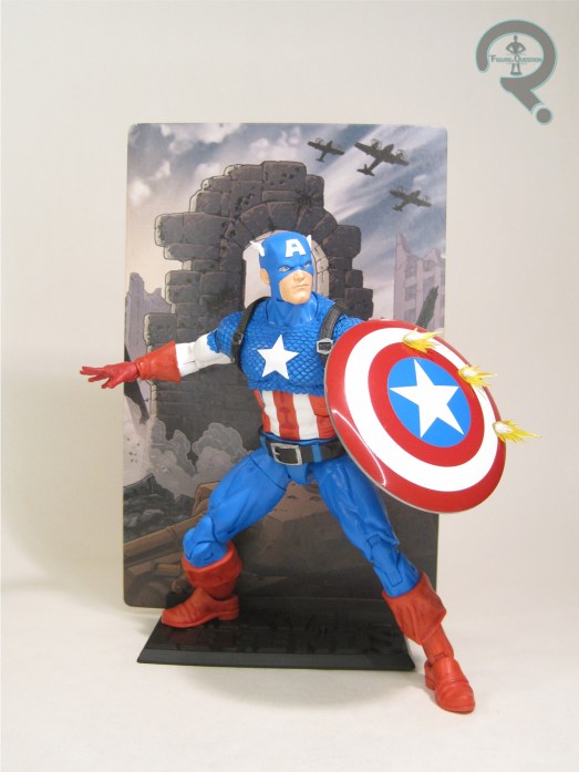 size of the shield, and I like the effects pieces…in concept. In practice, it results in three permanent holes in the shield, rendering it rather odd looking when the effects pieces aren’t in place. So close, and yet so far. Perhaps a future release will re-work the piece to remove the holes, and then we can have it all. Cap’s display stand is the same one included with Iron Man, and his backdrop is likewise double sided, with an illustration of the original figure’s stand on one side, and the cover to the issue of Captain America packed in with the Series 1 release. Yes, unlike Iron Man, Cap’s cover is actually the same one was the original figure. So, that’s a pretty cool touch.