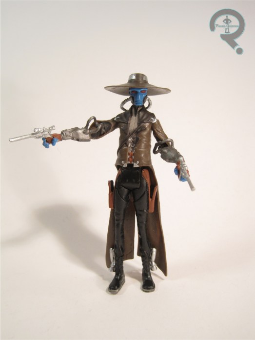 Cad Bane was released in the fourth wave of the 2009 re-launch of Hasbro’s Clone Wars line, where he was figure CW22. He was released alongside Clone Trooper Denal (who Bane notably impersonates after killing him in “Cargo of Doom”), as well as space versions of Anakin and Ahsoka. The figure stands about 3 3/4 inches tall and he has 11 points of articulation. Bane’s articulation is lesser compared to the best in the line, lacking any movement below the hips, as well as having rather restricted motion on the elbows. Also, due to the construction of his elbow joints, his arms have a tendency to fall apart in the middle a lot. All of this makes him a figure that’s just really not great for posing. He’s really just built for standing there. Given how much Bane does in the show, it’s kind of a shame. There were later versions with better articulation, but this one still wound up with the most releases by far, so the mold was just really persistent. The actual sculpt is at least pretty decent. Not a spot on recreation of the animation model, but pretty close, and about on par with the best of the earlier run sculpts, at least in terms of accuracy. His paint work is respectable; the colors match with his show design closely enough, and the blue skin gives him a nice and unique look. Cad was packed with a removable hat (which started the trend of Cad Banes with hats that are hard to keep in place), his two twin blaster pistols, and a larger blaster rifle (missing from mine).