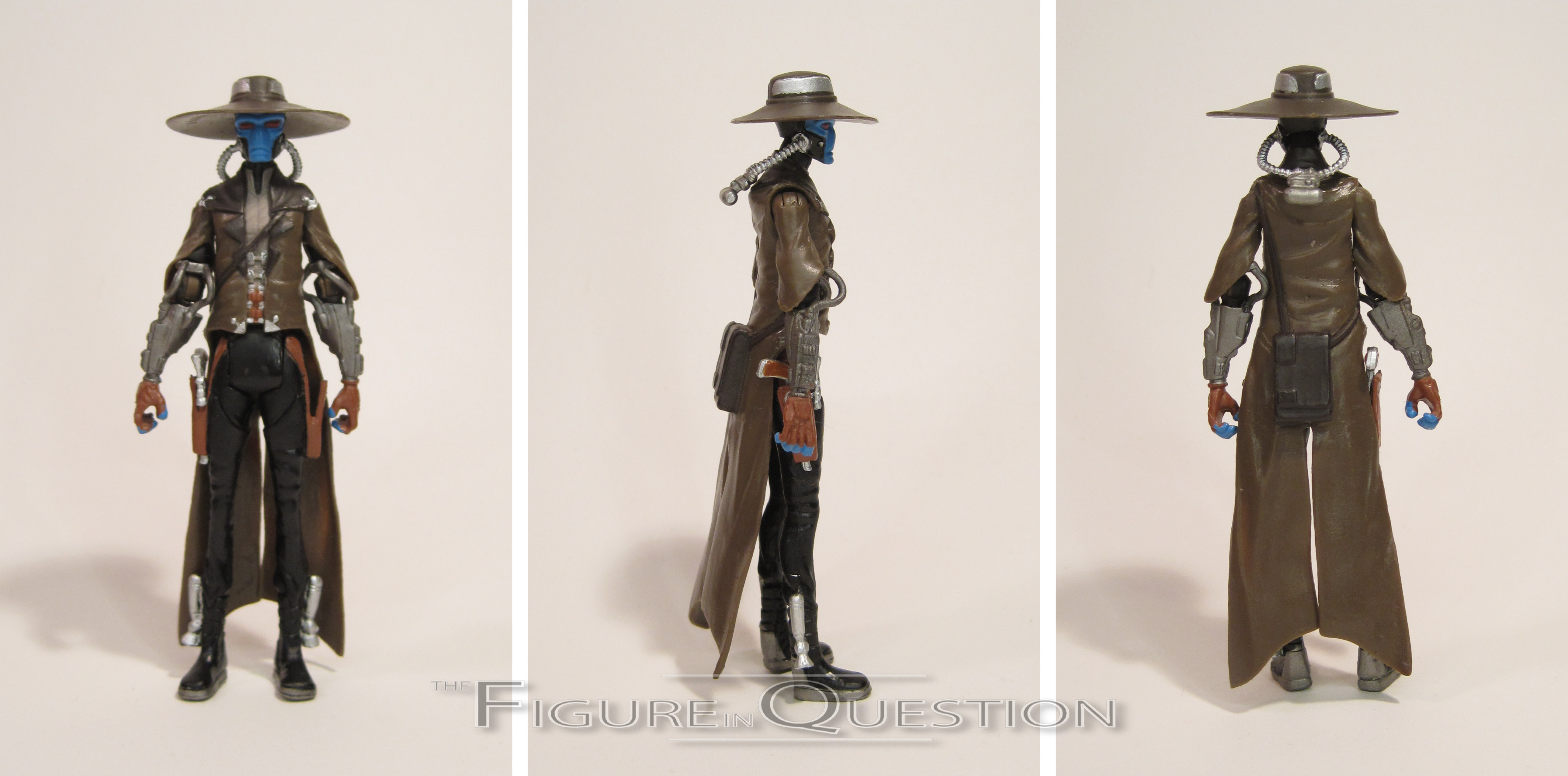 Cad Bane was released in the fourth wave of the 2009 re-launch of Hasbro’s Clone Wars line, where he was figure CW22. He was released alongside Clone Trooper Denal (who Bane notably impersonates after killing him in “Cargo of Doom”), as well as space versions of Anakin and Ahsoka. The figure stands about 3 3/4 inches tall and he has 11 points of articulation. Bane’s articulation is lesser compared to the best in the line, lacking any movement below the hips, as well as having rather restricted motion on the elbows. Also, due to the construction of his elbow joints, his arms have a tendency to fall apart in the middle a lot. All of this makes him a figure that’s just really not great for posing. He’s really just built for standing there. Given how much Bane does in the show, it’s kind of a shame. There were later versions with better articulation, but this one still wound up with the most releases by far, so the mold was just really persistent. The actual sculpt is at least pretty decent. Not a spot on recreation of the animation model, but pretty close, and about on par with the best of the earlier run sculpts, at least in terms of accuracy. His paint work is respectable; the colors match with his show design closely enough, and the blue skin gives him a nice and unique look. Cad was packed with a removable hat (which started the trend of Cad Banes with hats that are hard to keep in place), his two twin blaster pistols, and a larger blaster rifle (missing from mine).