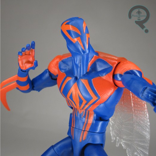 Spider-Man 2099 is the fifth figure in the Across the Spider-Verse tie-in series of Marvel Legends. Much like the Spot, 2099 is a design that’s largely unchanged from his comics counterpart, really just relying more on stylization to change things up. Given how strong and distinctive 2099’s look, this is hardly a surprise. The figure stands about 6 3/4 inches tall and he has 30 points of articulation. 2099’s articulation is one of this assortment’s most restricted, which is admittedly odd, since it doesn’t really feel like there’s any clear reason for that. He just winds up with a slightly more rudimentary articulation layout. It’s not *bad*, mind you, just a little bit clunky, and therefore a little surprising to see. He does at least still get a ball-jointed neck, as well as the pinless construction on the arms and legs. 2099 is sporting an all-new sculpt by sculptor Arlen Pelletier, and aside from issues with the articulation breaking it up a bit too much during posing, I really quite like it. He’s notably bulkier and taller than the other Spiders, which I definitely dig, and which is also in line with his animation model. The detailing is all nice and sharp, and it’s nice to see Miguel get full sculpted elements for his costume, after being relegated to largely just paint on his last few Legends. 2099’s paint work is overall pretty on the basic side. He’s blue with red accents, and a lot of that’s molded. The colors are rather bright, and they’re flat, straying away from his usual metallics. It makes sense, of course, given the desire to stick with the animation look, which isn’t as shiny looking as the comics. I feel like there should be some sort of darker accenting on the blue sections, and the sculpted textures on the red get a little lost with nothing to make them pop, but as far as the basics go, he’s alright. Miguel is packed with two sets of hands, in fists and open gesture. It’s too bad we didn’t also get an unmasked head like with the others, but it’s possible that model wasn’t finalized in time. Still, he feels a tad light.