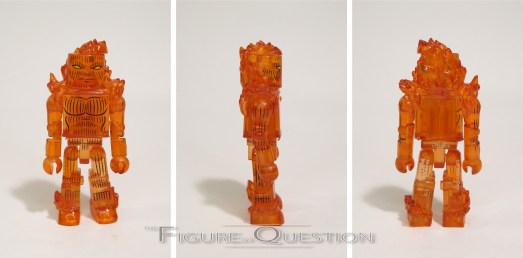There was a Human Torch in Series 48, but that one was a half-step partially flamed on version. This one, on the other hand, is a fully flamed-on version, making him a direct update to the two prior Torches. He’s built on the standard post-C3 Minimate body, so he’s about 2 1/4 inches tall and he has 14 points of articulation. He gets an add-on for his flames that slips behind the head and over the shoulders, and also gets a non-standard set of feet with some flame effects (shared with his Series 48 counterpart). They add flame detailing, while still keeping him very much a core ‘mate, making him more of a proper classic Human Torch. Aiding in the classic Torch set-up is the paint work, which does the scorch lines look that’s a very early comics look for him. It’s specifically patterned after the John Byrne version, allowing him to fit in with the similarly Byrne-inspired FF from Series 48. Some of the details get a little lost on the figure, since he’s transparent and all, but it works well, and it’s certainly the best take on a fully flamed on Johnny the line has gotten. Human Torch is packed with two flame effects for his hands, as well as a rather elaborate flame stand in the shape of a “4”, and a clear display stand (which debuted as a standard feature in this assortment and in Series 48).