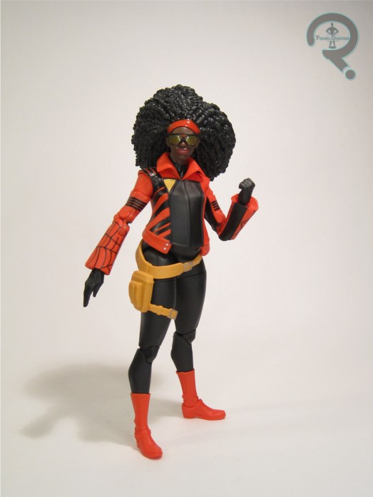 Jessica Drew is the second to last figure in the Across the Spider-Verse tie-in series of Marvel Legends. Jessica is sporting one of the most drastically different designs of any of the characters, making this figure almost entirely new territory. She’s definitely using elements of Valerie’s look, in conjunction with her slightly more “real-world” costume design from her post-“Spider-Verse” solo book (including having her be pregnant), and then just a handful of just genuinely new costume elements. The figure stands just shy of 7 inches tall and she has 28 points of articulation. Jessica joins 2099 as one of the most restricted figures here in terms of posing. Again, it’s nothing terrible, and at least in her case it’s less about poor implementation of articulation and more about her movie design being a bit more limiting. Since she’s pregnant in the film, there’s less you can do with the waist, hips, and mid-torso. And, given the size of the hair, the neck joint is also pretty limited. There’s *some* posing to be had, but not a ton. She’s also not incredibly stable on her feet, due to the weight distribution of the sculpt, so what posing you can do is further limited. The sculpt here is an all-new one, which looks to do a respectable job of capturing the animation design. The only real issue is with the glasses, which are just plainly the wrong shape for the movie. Otherwise, there’s a nice mix of textures, with quite a bit of detailing going into the hair sculpt, contrasting well with the smoother nature of the costume, especially the sharper lines of the jacket. One thing I’m not super crazy about is how the hair hangs off the back of the head; there’s a notable section of the base of the head that’s just exposed, which doesn’t quite seem right. Jessica’s color work is, as per usual at this point, pretty basic. There’s a lot of molded plastic, with enough paint to sell the needed design elements. The paint’s all generally pretty clean in application, and she’s using the face printing for the eyes, which works pretty well. Jessica continues the trend of the figures in this set being light on the accessories, with just two sets of hands in fists and relaxed. At the very least a few extra poses might have been nice.