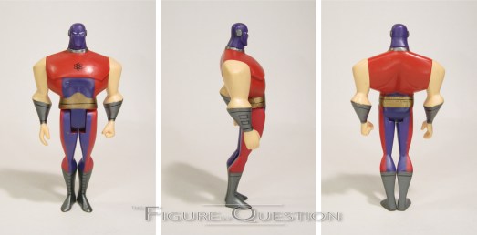 Atom Smasher was first added to Mattel’s Justice League Unlimited tie-in line in the third assortment of three-packs, released in early 2005. He was packed alongside re-packs of the more articulated Green Lantern and Flash figures. He was re-released later that same year as a single release. The figure stands about 4 3/4 inches tall and he has 5 points of articulation. Atom Smasher is based on the larger male base body, based on tooling that originally belonged to the first Superman figure. It’s the largest available base body, and one that matches respectably well with how Atom Smasher is depicted on the show, at least in terms of build. He was, however, almost always shown as above average size, so he’s woefully short for Atom Smasher. But, without the re-use, it’s not like he was going to get made. His only new part is a head sculpt. It’s a little on the small side, but that seems to match with his internal proportions alright. It’s fully masked, so there’s not a ton of detailing, but it gets what it needs to. The rest of the detailing is carried via paintwork, which is handled alright. Not amazing, or anything. Of note, the sections that should be blue are more of a purple. That, coupled with the slightly darker shade of the gold for his belt, kind of muddies the overall look of his design. At the very least, a little bit more actual line work may have helped to differentiate the costume elements just a bit more. As it stands, it’s okay, but just sort of “meh.” The three-pack version of Atom Smasher didn’t include any extras, which was honestly okay, since he doesn’t use much. For the single release, he got an extra large hand clip-on piece.