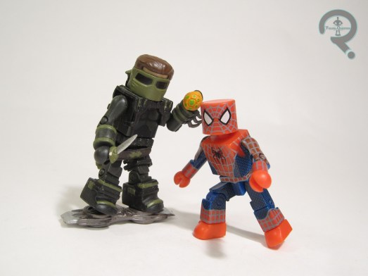 Despite all the nay-saying about it, I was very excited for Spider-Man 3‘s release, loved seeing it in the theatre, and was thrilled to get the tie-in stuff for it, with the Minimates in particular being high on my list.  I got the full standard set of the tie-ins from my parents for Christmas the year that they came out.  The basic Spider-Man’s not a lot too look at on first glance, but the extra detailing is certainly cool.  New Goblin may not be the most thrilling design, but I think he translated well, and he marked a real turning point for how sculpting could interact with the core ‘mate body.