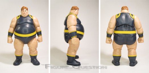 The Blob is a deluxe standalone Marvel Legends release, timed to hit during the 60th anniversary of the X-Men, with all of the associated tie-in stuff for that. This is Blob’s second time getting the Legends treatment, following up on the Build-A-Figure version released in Hasbro’s second ever Legends assortment. It’s been a long 16 years waiting for an update. The figure stands about 8 inches tall and he has 26 points of articulation. Blob’s articulation scheme works surprisingly well given his bulk. I especially like the range on the neck joint; the ball-joint is very well placed there. The range on the elbows is also pretty solid, but the slight offset to that is that they break the flow a bit when posed. Not that it’s the end of the world, or anything. Also, the weight distribution on this guy works out quite nicely, allowing for some really fun posing options, with running poses and the like. Blob is sporting an all-new sculpt; the Build-A-Figure had a rather stylized look to him, angling for a more grotesque appearance, in line with some of the more monstrous additions from Toy Biz’s tenure (which makes sense, since Toy Biz’s team actually sculpted the original Blob). This one’s a bit more all-purpose, going for a more classic comics styling.