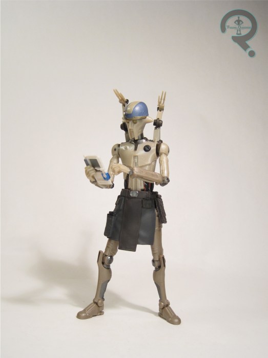 on molded plastic, and I’m typically not a huge fan of that when it comes to metallic finishes. In Huyang’s case, I find it doesn’t bug me as much. In the show, he’s not really got the same metallic look as other droids, and this plastic’s also not the swirly kind, so it just works out better. There’s still a fair bit of paint, which is cleanly applied, and hits most of the marks it needs to. The only spot that really feels as though it’s missing application is the tool belt, which is untouched, except for the buckle. Huyang is packed with his pack with the extra arms, a data pad, and a…tool? I don’t know what it is, and even the Hasbro photographers have him holding it quizzically in the stock shots, so it appears even they don’t know for sure. Hey, it’s better that nothing, right?