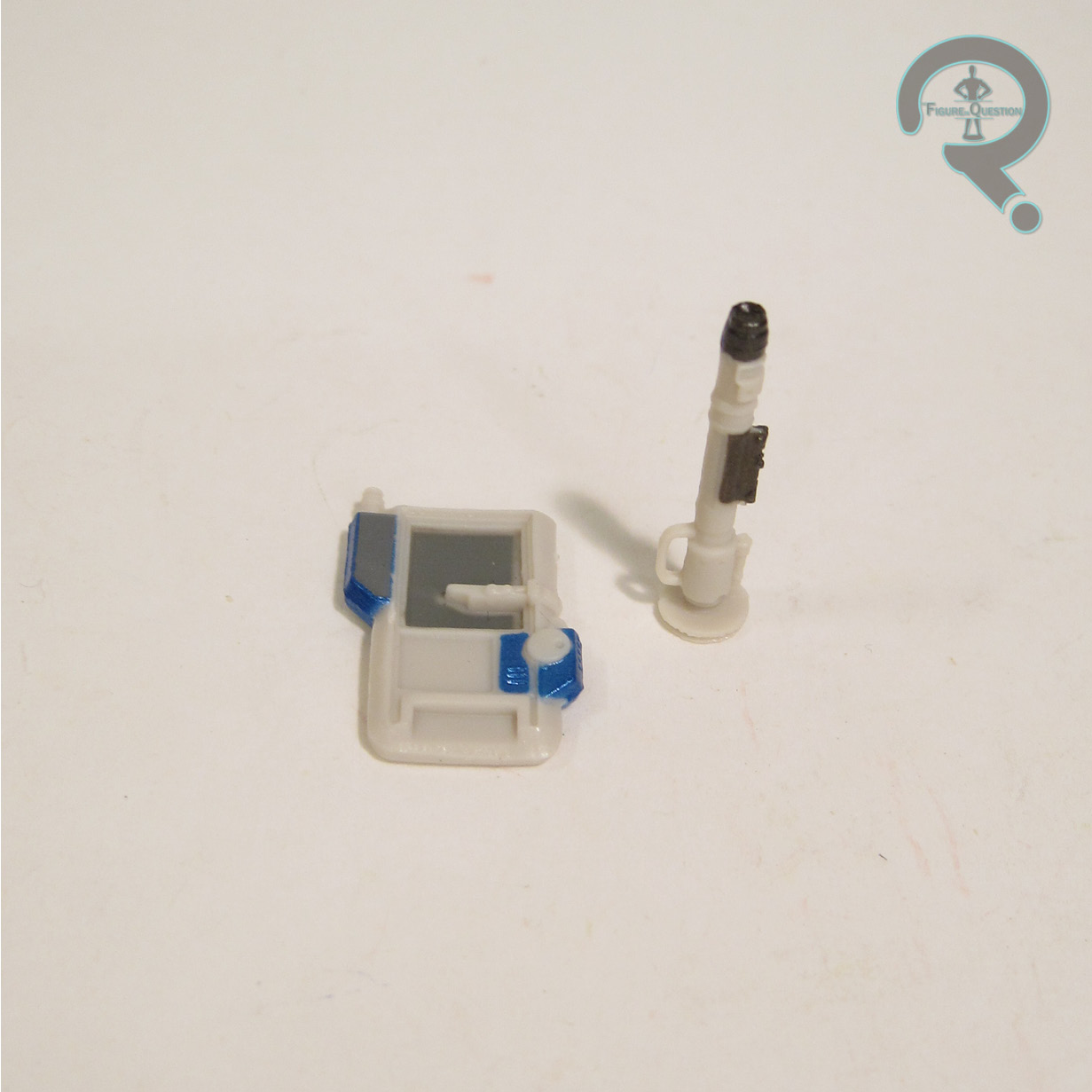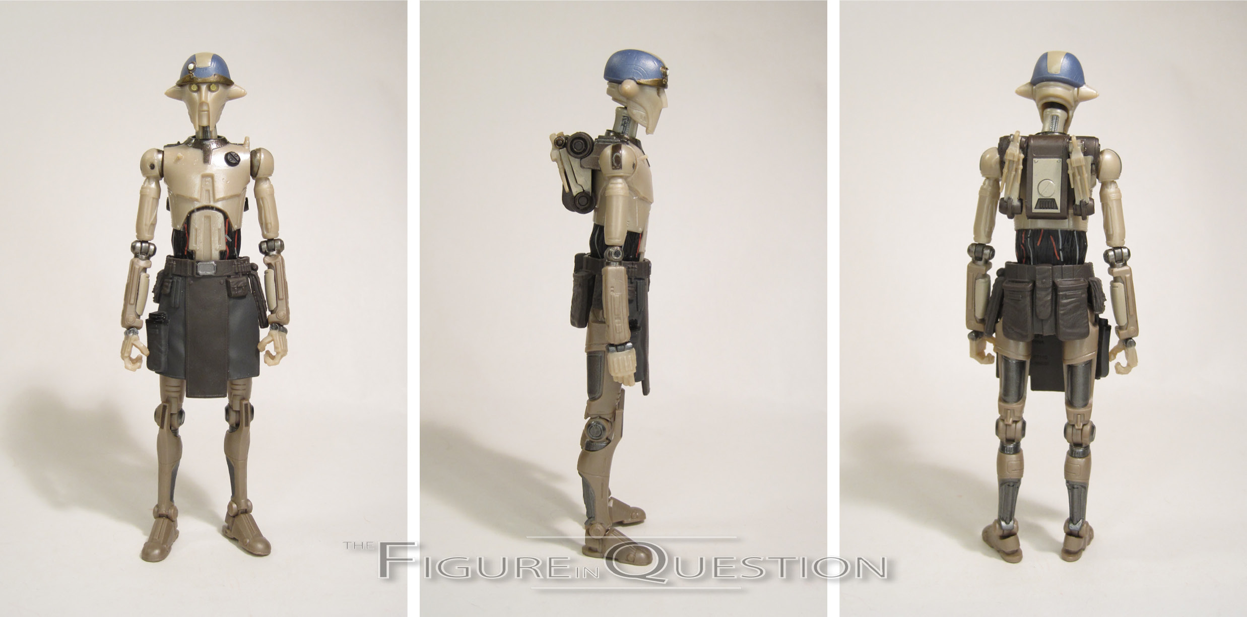 on molded plastic, and I’m typically not a huge fan of that when it comes to metallic finishes. In Huyang’s case, I find it doesn’t bug me as much. In the show, he’s not really got the same metallic look as other droids, and this plastic’s also not the swirly kind, so it just works out better. There’s still a fair bit of paint, which is cleanly applied, and hits most of the marks it needs to. The only spot that really feels as though it’s missing application is the tool belt, which is untouched, except for the buckle. Huyang is packed with his pack with the extra arms, a data pad, and a…tool? I don’t know what it is, and even the Hasbro photographers have him holding it quizzically in the stock shots, so it appears even they don’t know for sure. Hey, it’s better that nothing, right?