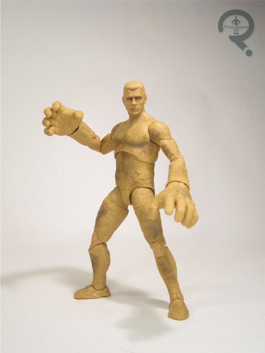 look. Due to pandemic-related issues, Thomas Hayden Church was unable to be physically on set for filming. As such, Flint remains sandy, even when person shaped. This figure works with that, so he’s got a sandy texture over the whole thing. He’s still got a strong likeness of Haden Church, even under all the texture, and the body’s build matches well too. His color work is minor; he’s a lot of tan. There’s accenting to better make out the face, as well as a little bit of darker detailing throughout the body. Sandman is packed with two sets of normal sized hands (in fists and open), as well a set of enlarged hands, with matching pieces to bulk up the forearms.