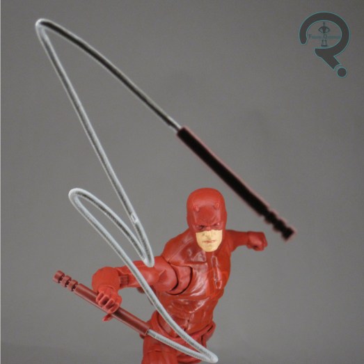 is actually pretty subdued. While other all red Daredevils have used multiple shades of red to differentiate the gloves and boots from the rest of the suit, this one makes almost everything the same shade of red, with only the eyes, logo, and belt buckle being differentiated. What’s visible of the face also gets some printed detailing, which is quite lifelike. DD is packed with two sets of hands (fists and gripping), his batons, and the dynamic zipline piece that clips between the two of them.