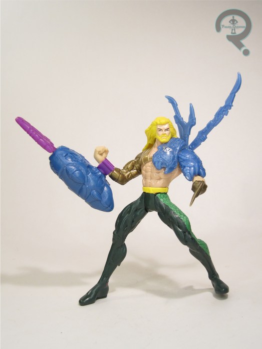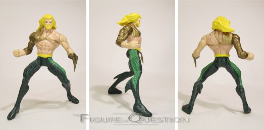Aquaman was released in 1996 as part of the first series of Kenner’s Total Justice line. This was Kenner’s second time doing an Aquaman, following their Super Powers offering in the ’80s. That one was, of course, in his classic attire, while this one was, as noted above, all edgy. The figure stands just shy of 5 inches tall and he has 5 points of articulation. Well, 5-ish. The neck joint’s pretty my useless, what with the hair, and the range on the hips is also pretty restricted. You can spin those shoulders all the way around, though. Total Justice figures are, of course, defined by their extreme posing. Aquaman follows suit, and has perhaps one of the most extreme poses the line had to offer. So extreme that he can barely even stand most of the time, which is a bit frustrating at times. Why the pre-posing? What exactly is the pose? I have no