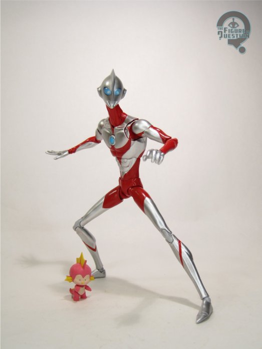 bad with it, though. The silver’s maybe a touch flatter than it should be, but it’s cleanly applied, as is the red around it. Everything is very crisp, and I do quite like that. Ultraman is packed with five pairs of hands (in fists, relaxed, light gesture, wide gesture, and flat), two color timers, and three separate eye plates, allowing him to look forward, and off to either side. I particularly love the eyes; they add so much expression to the figure! Not to be outdone, there’s also the Emi figure included. She’s very tiny, at just over an inch tall, and she’s got 5 whole points of articulation, which doesn’t do a ton, but it does do enough. Though small, the sculpt is quite accurate, and she scales nicely with Ken. She’s even got her own accessory, a little stand that goes under her tail to help her keep her balance.