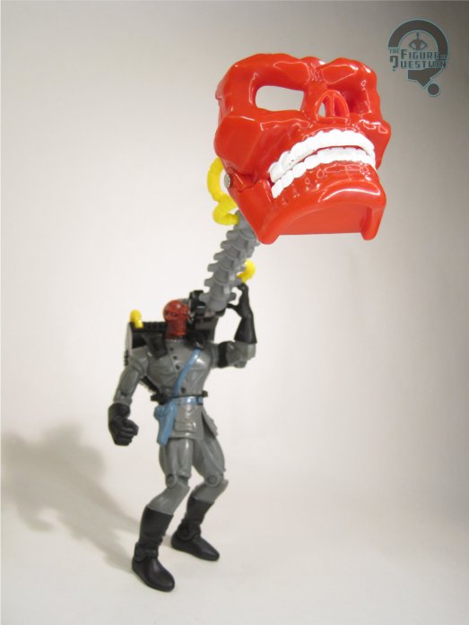 notably large hands and feet. The head also seems a little too actually skull-like for his usual looks. The left hand appears to be sculpted to maybe hold, oh, I don’t know, a cube, or something? But nothing of the sort is included. The color work on Red Skull is generally basic, but there’s some decent accent work on the head to help with the sculpted details. Red Skull is packed with his own “Flip ‘N Trap” thingy, which is a backpack with a large red skull thing at the front. It launches these small yellow rubber spider things. It’s honestly more of a space filler than anything, and doesn’t really do much for the core figure, but it’s not terrible.