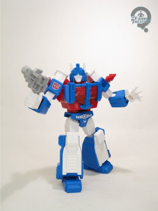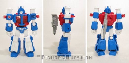 Ultra Magnus is part of the Transformers Galaxy Version line’s fourth assortment, dubbed “Fractured Space-Time.”  He’s one of the standard 1 in 9 blind box figures from the set, making him an even chance compared to all the other standards.  This is the line’s second Magnus, following up on the requisite white Optimus repaint in the third series.  This one, however, is the proper fully armored Magnus that everyone really wants.  Since these are model kits, they’re unassembled right out of the box.  You get three parts trees and a bag of loose parts, which you assemble to get the figure.  Assembly isn’t bad.  It’s not too intense, but you definitely want to make sure you get things right the first time around, because it holds together really tightly, and it can be tricky to pull things back apart to fix them.  But, as I said, once assembled, the figure holds together really well, and gives him a pretty solid weight.  When assembled, the figure stands 4 1/4 inches tall and he has 18 points of articulation.  The sculpt for this guy is clearly animation based, specifically on the G1 cartoon, as are most of the Galaxy Version kits.  A lot of the core parts are shared between all of the figures in the set, and those all work well.  The Magnus-specific parts are all really nicely handled, very clean, and mesh well with the standard parts.  There’s some slight deforming to the design, but it’s pretty minor on Magnus specifically.  Magnus’s color work, which is largely achieved via the separate plastic pieces, is quite vibrant.  There’s a little bit of extra detailing on a few of the parts to fully sell the design.  Magnus’s build also gives him two sets of hands to swap out (gripping and open gesture), his rifle, an energon cube, a faction insignia, and a stand.  That’s actually quite a bit for such a small package, and covers pretty much all of your bases.