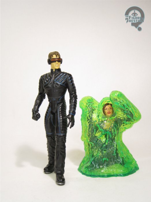 very prone to breaking. But, it does look really cool when its properly in place, and it stays there pretty well. Cyclops’s paint work is decent enough. It’s pretty cleanly handled, and the color scheme is a solid match for the film. The skin tone’s a little pasty, and perhaps a little thick, but it works reasonably well. There were a few different takes on the exact details of the suit and its different piping, which got brighter and more obvious applications as the different production runs hit. Cyclops was packed with both his visor and an alternate pair of sunglasses (which are even *more* fragile than the standard visor), as well as a figurine of Jean, clearly meant to be based on the scene in the movie where she gets hit by Toad’s slime and Scott has to blast it off her. Of course, she’s not completely encased by the slime the way she is here; it’s actually just on her face in the movie, which is, amusingly, the one piece that mine’s missing. She’s also based on the first Jean mold, so she’s got the wrong hair style, but beyond that, I guess it’s an okay extra, weird though it may be.
