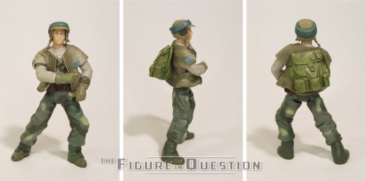 The Endor Rebel Soldier is figure No. 33 in Hasbro’s Star Wars Saga line-up.  He was part of Collection 2 and was released in 2002.  There were two variants: one bearded and one not.  This one is the not, in case you couldn’t tell.  He was the later of the two releases, and the rarer when the line was new, though it seems like after the fact, they’re pretty evenly balanced.  The figure stands 3 3/4 inches tall and he has 10 points of articulation.  The articulation’s not a bad count, but it’s largely unusable thanks to how the sculpt is set-up.  Like the rest of the line, this guy is very pre-posed.  He’s got sort of a lunging-while-pointing-his-blaster look, which, I guess isn’t a terrible choice for the character.  Honestly, the arms aren’t bad (though they’re hit pretty badly by the sculpt interfering with articulation, since the jacket overlay piece covers the shoulders, making those joints essentially worthless), but the legs seem a little odd.  Also, with such a very specific pose, army building feels a little difficult, since you wouldn’t expect a bunch of guys to all be running around in exactly the same rather strange fashion.  Unlike prior Endor Rebels, this one got a removable helmet.  It’s a nice piece, and it sits very well on the head.  Said head is a nice sculpt of its own.  It doesn’t appear to be based on any specific Rebel from the movie, instead going for more of a general purpose thing.  The paint work on this figure is notable for being the first time we really got a proper deco based on what the Rebels are actually wearing in the movie, rather than the straight green up and down.  The camo pattern on the legs is a little odd, and the feet are the wrong color, but it generally isn’t bad, and the application works out pretty well.  He’s packed with his blaster rifle and a backpack.  The rifle’s a bit warped, since he was packed holding it, but it does at least get the cool blast effect piece, which is pretty nifty.