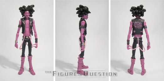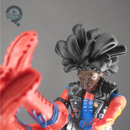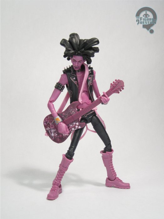 shot, making him look like an ever-changing assortment of punk-rock fliers and photos. The first figure had his “standard” colors, while this one goes for an alt look, which is a monochromatic purple. It’s a rather unique look with some decent pop to it. The paint’s not bad; technically, there’s less applications than the standard, but what’s there remains pretty strong. Spider-Punk gets the same alternate hand and guitar as the last release, but now in colors to match the new figure. He also gets the same unmasked head that’s already on the body, but in standard colors, meant for use with the regular figure. There is, however, no *masked* head for this figure, so he’s in a similar boat to the original release. The mold’s already there, so it’s a pretty egregious omission.